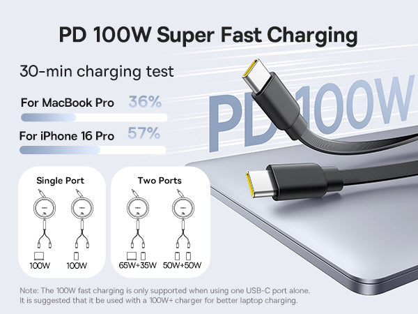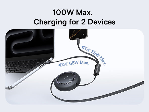 بفضل قدرة توصيل الطاقة المذهلة التي تصل إلى 100 واط، يدعم هذا الشاحن الشحن السريع للهواتف الذكية والأجهزة اللوحية وأجهزة الكمبيوتر المحمولة وغيرها، مما يضمن حصول أجهزتك على الطاقة التي تحتاجها بسرعة. يتيح لك التصميم القابل للسحب بطول 1.2 متر ضبط الطول الذي تحتاجه ثم سحبه بسلاسة إلى حجم صغير - مثالي للسفر أو العمل أو الاستخدام اليومي.