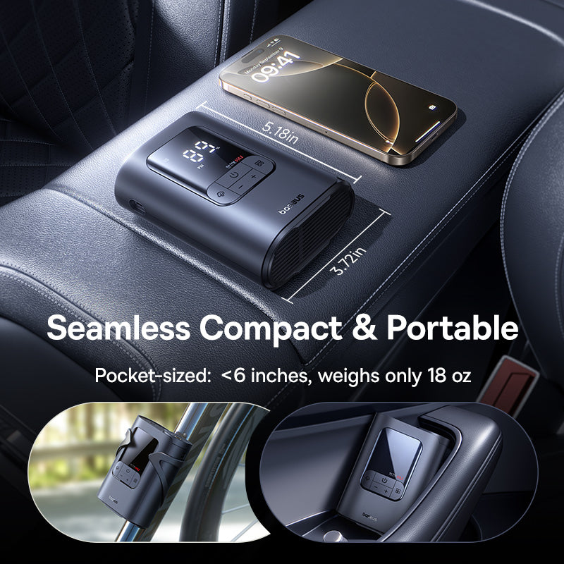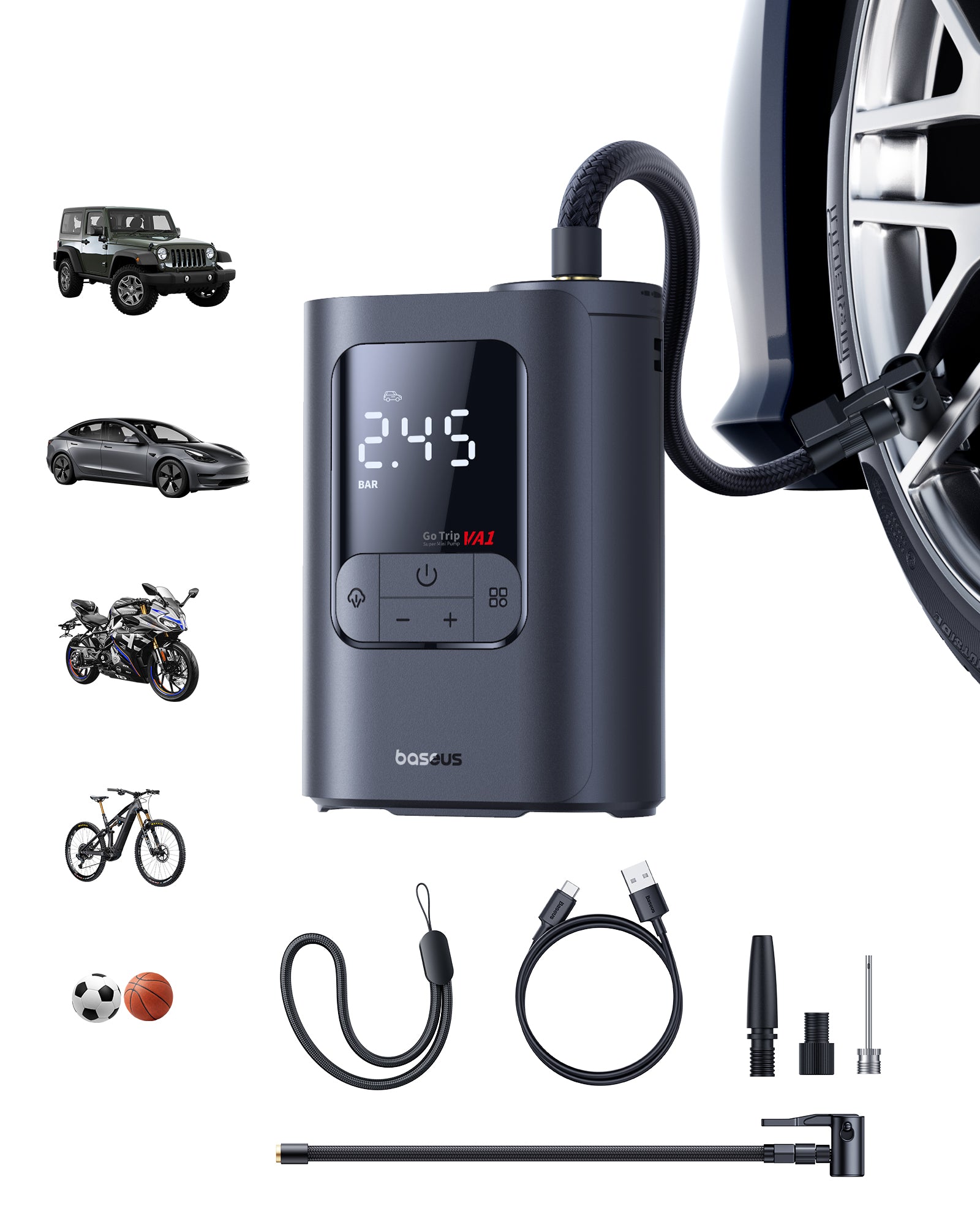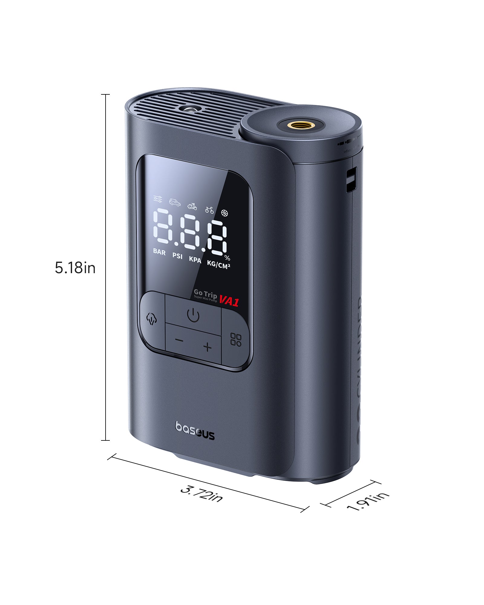 مضخة Baseus GoTrip VA1 Max Super Mini اللاسلكية هي مضخة محمولة صغيرة الحجم لكنها قوية، مصممة للسيارات والدراجات وغيرها من المنتجات القابلة للنفخ. تتميز بمحرك ذي 22 أسطوانة، مما يوفر نفخًا سريعًا وفعالًا بأداء ثابت. مع ضغط أقصى يصل إلى 150 رطل لكل بوصة مربعة، و5 أوضاع نفخ، وبطارية تدوم طويلًا بسعة 7500 مللي أمبير، تضمن استخدامًا متعدد الاستخدامات وموثوقًا.