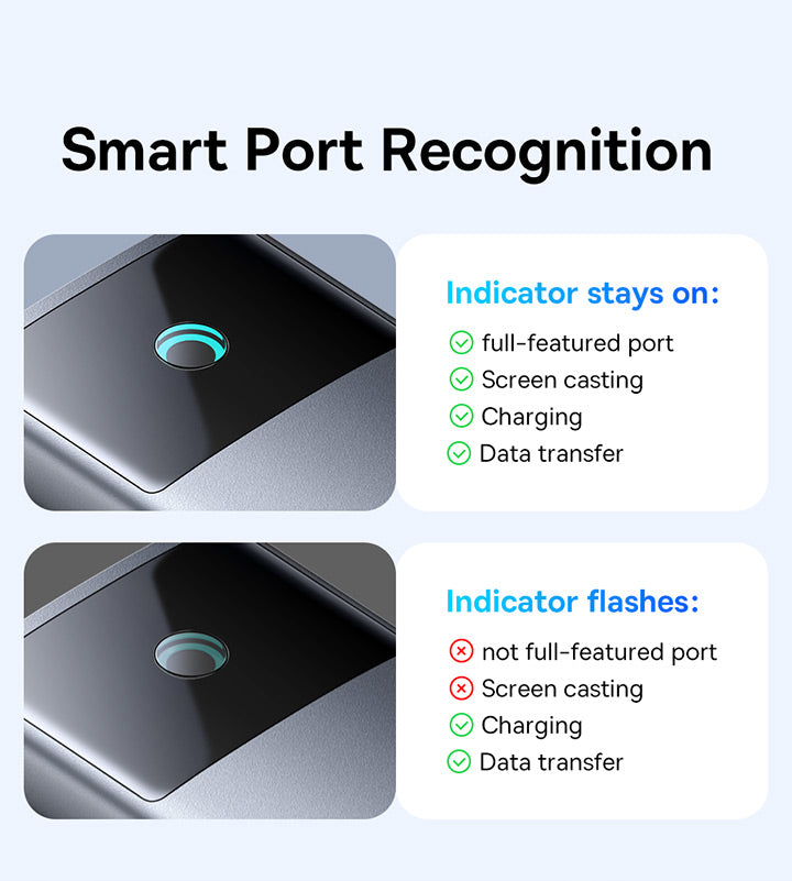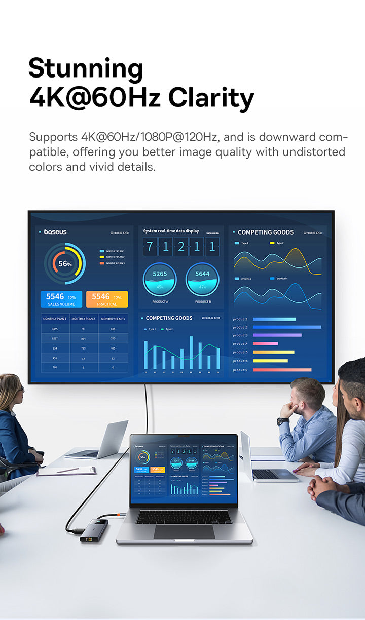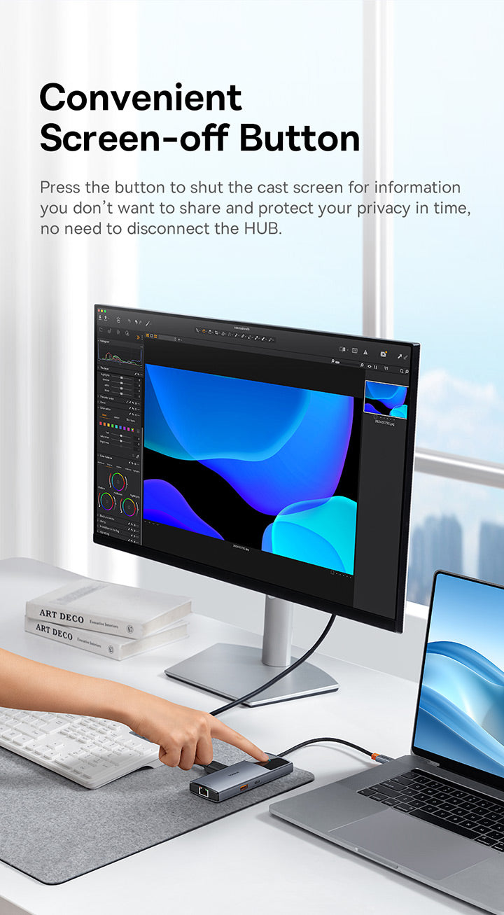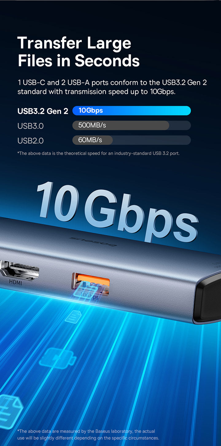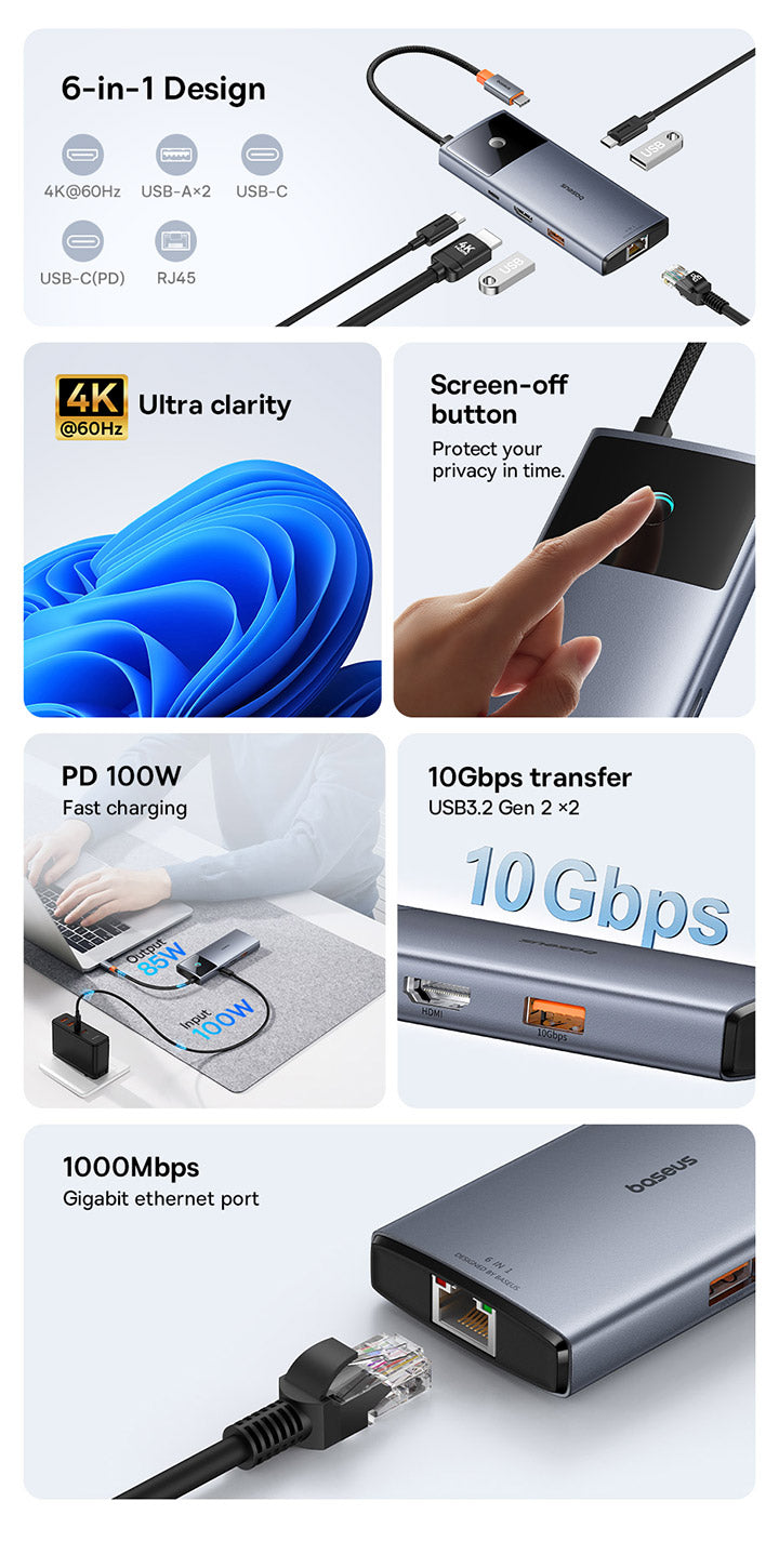منافذ متعددة: منفذ USB-C إلى منفذ HDMI واحد بدقة 4K@60Hz + منفذ USB-C واحد (10 جيجابت في الثانية) + منفذان USB-A (10 جيجابت في الثانية) + منفذ RJ45 واحد + منفذ USB-C واحد (PD)