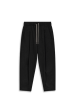 خصر أسود مطاطي مع رباط، مطوي، جيوب جانبية، ساق مستقيمة، جيوب خلفية مزودة بأزرار.