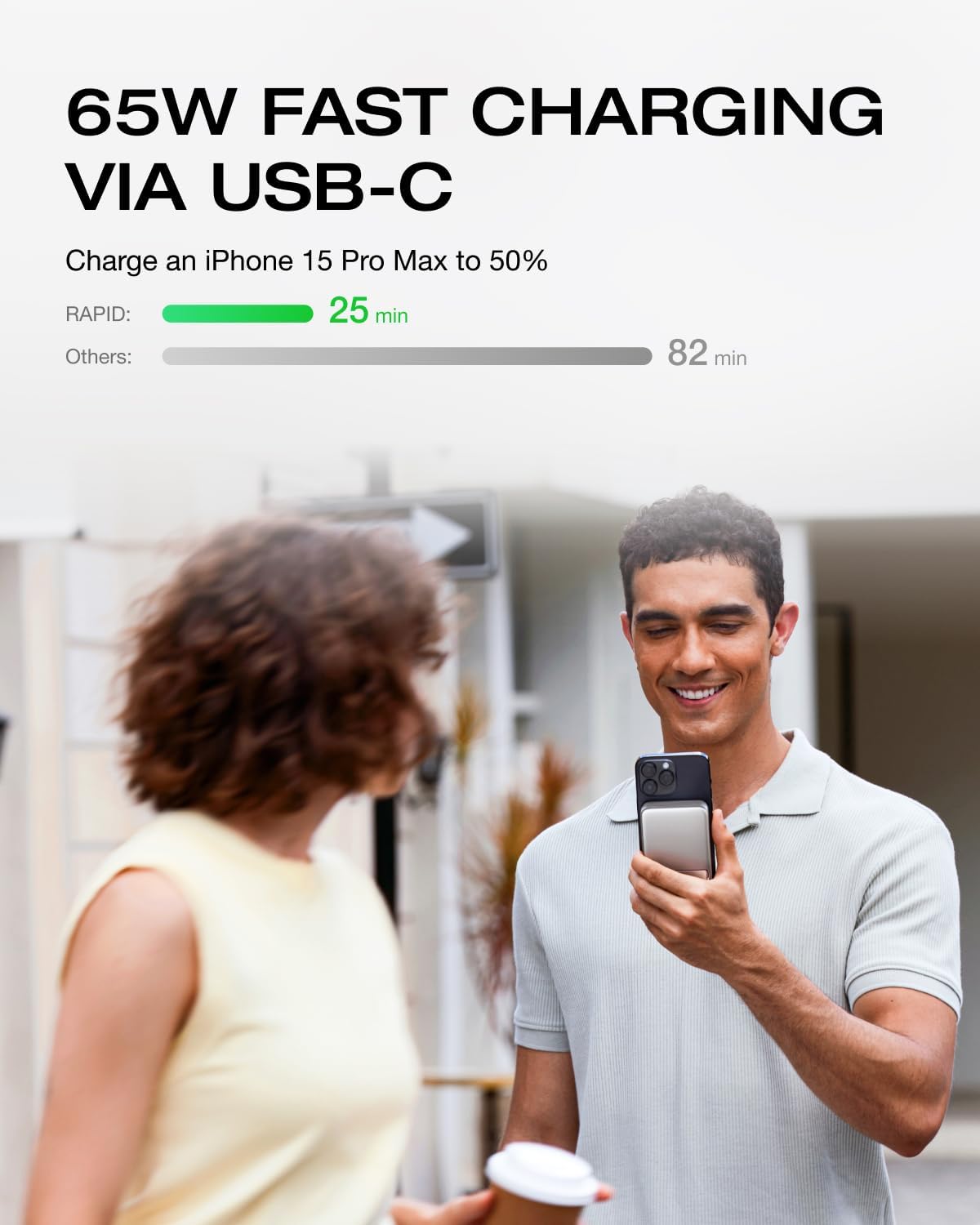 شحن فائق السرعة مع كابل مدمج بقوة 30 واط/65 واط: مع الكابل المدمج بقوة 30 واط/65 واط، لم يعد هناك حاجة لحمل كابل إضافي للشحن فائق السرعة. استمتع بسهولة الشحن المغناطيسي بأقصى سرعة أينما ذهبت.