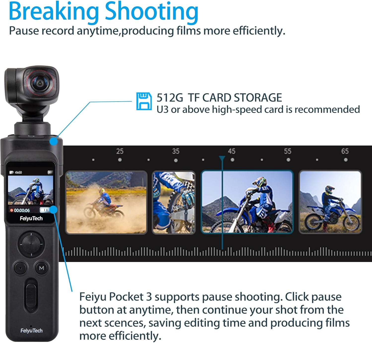 أثناء التصوير باستخدام Feiyu Pocket 3، ما عليك سوى النقر لإيقاف مؤقت في أي وقت، ثم استمر في لقطتك من الإطار التالي، مما يوفر وقت التحرير ويساعد في إنتاج الأفلام بكفاءة أكبر.