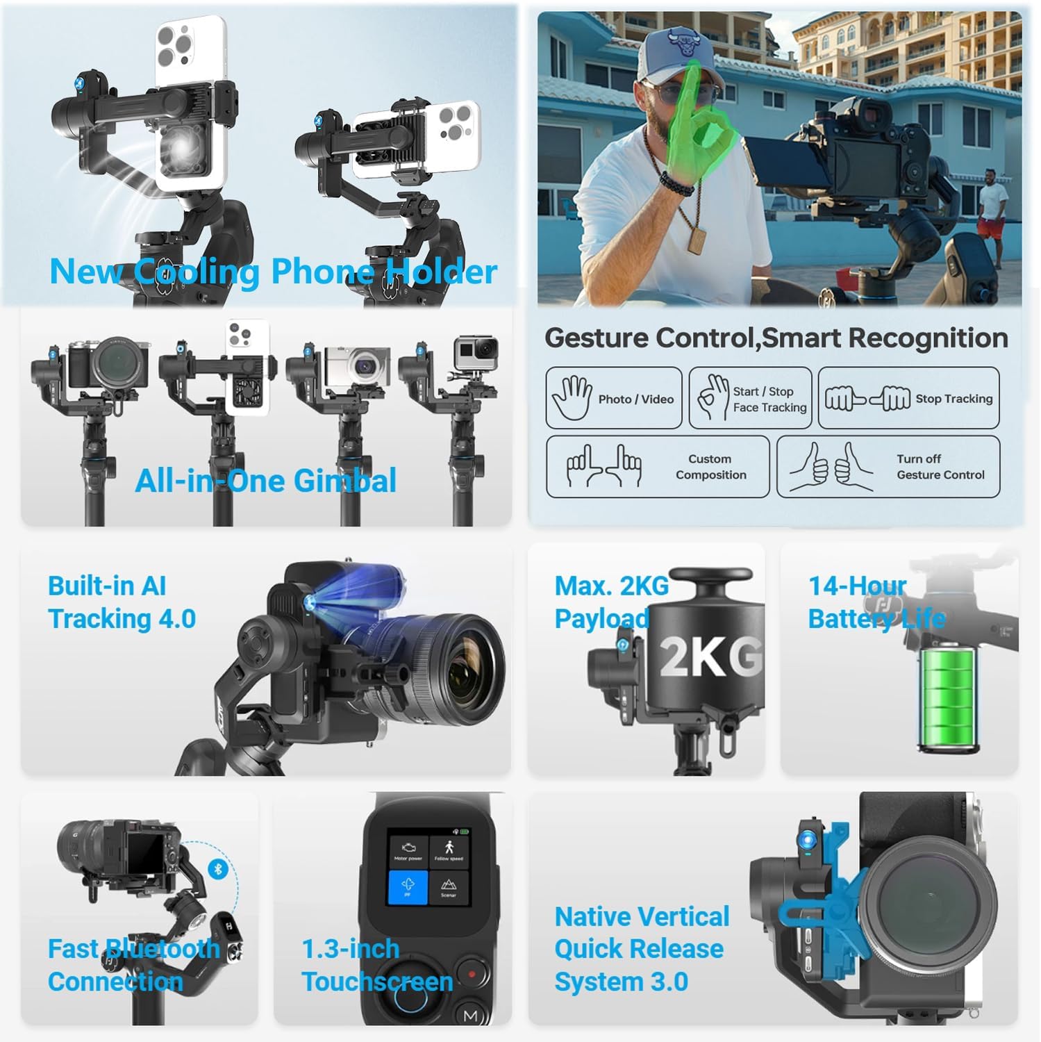 بفضل تقنية تثبيت الصورة 10.0 وخوارزمية رباعية الأبعاد 2025 الأحدث، يحافظ هذا الجيمبال على سلاسة لقطاتك وخلوها من الاهتزازات - حتى في المشاهد سريعة الحركة. التقط نتائج احترافية وعالية الجودة سينمائية في أي وقت وفي أي مكان، وهو مثالي للصور الحركية أو السفر أو مدونات الفيديو.