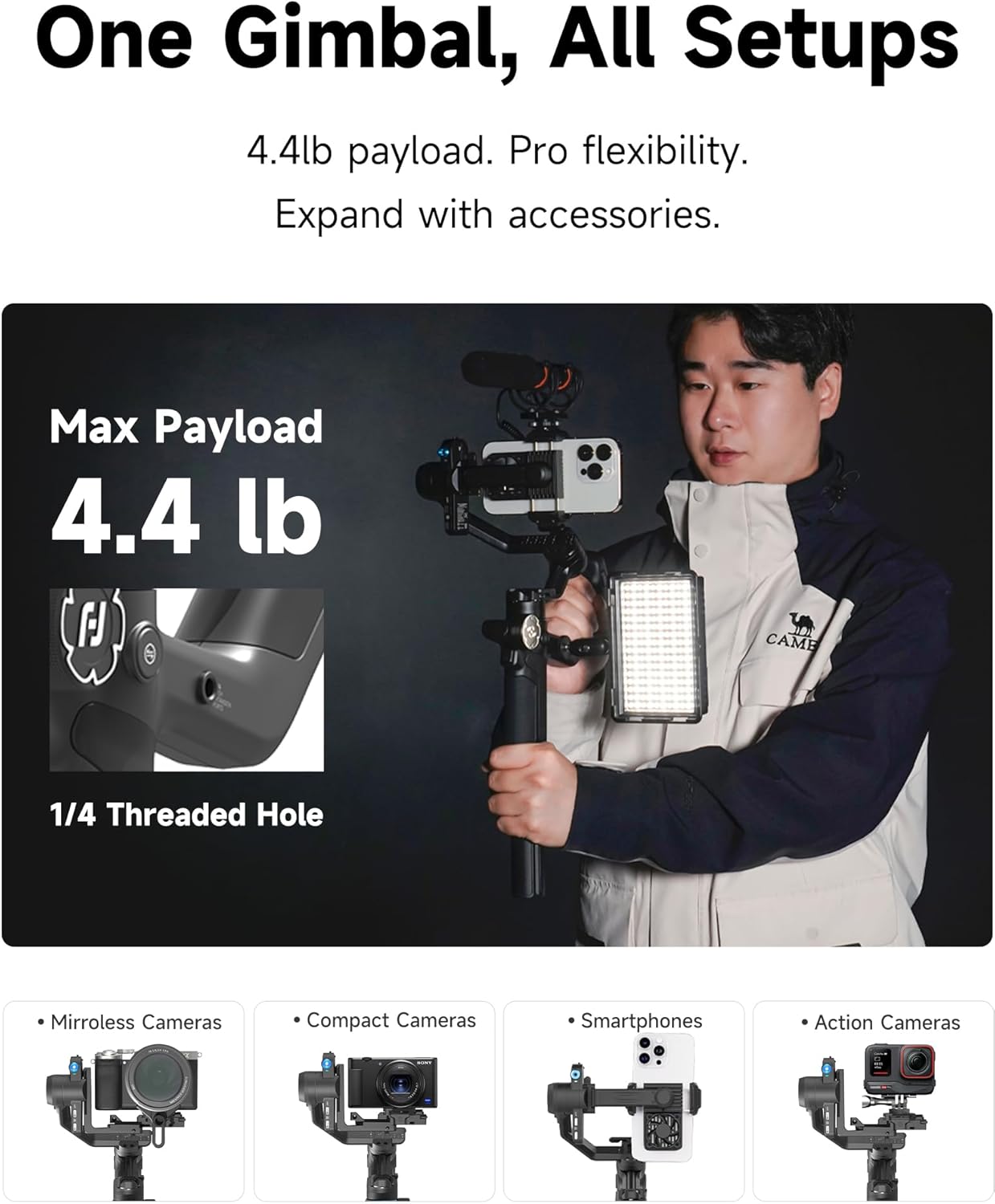 خفيف الوزن، صغير الحجم، وسهل الاستخدام للمبدعين، يدعم الكاميرات عديمة المرآة، والكاميرات المدمجة، وكاميرات الحركة، والهواتف الذكية - حتى تتمكن من التصوير بما لديك، متى ما هبت الروح الإبداعية. جهاز تثبيت الكاميرا متعدد الاستخدامات لجميع معداتك.