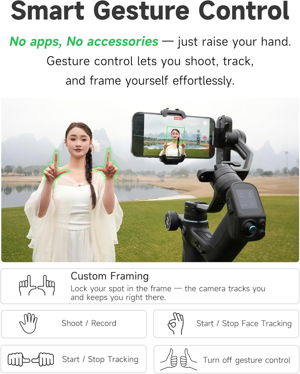 مع خمسة عناصر تحكم مدمجة بالإيماءات، يمكنك بدء أو إيقاف التتبع، والتسجيل، وتخصيص الإطار. حتى عند التصوير بمفردك، ستشعر وكأن لديك مصورًا شخصيًا مزودًا بالذكاء الاصطناعي بجانبك.