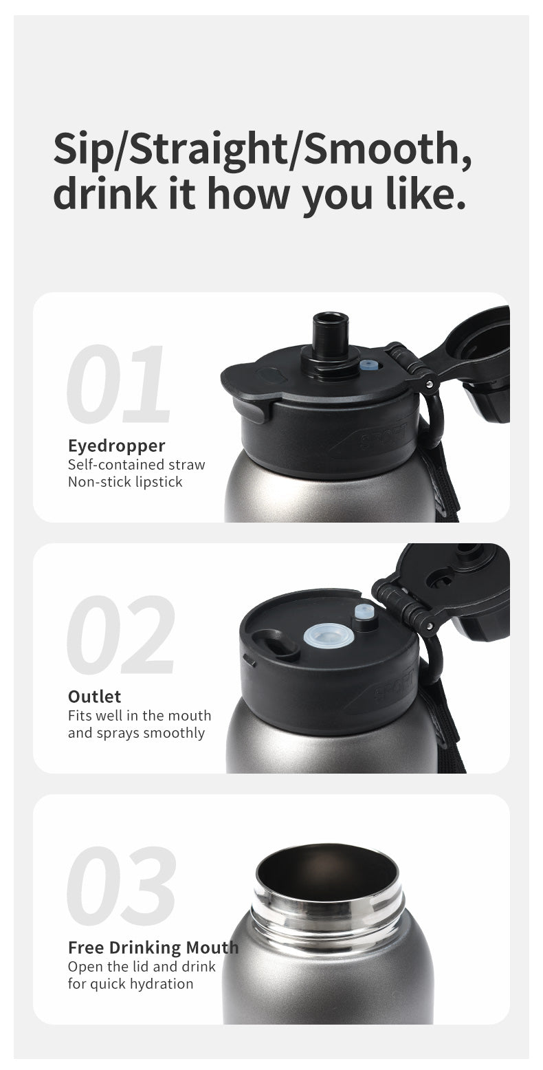تصميمها الأنيق يضمن سهولة التعامل والحمل، بينما يمنع الغطاء المحكم التسرب، ويحافظ على جفاف حقيبتك ومتعلقاتك. مثالية للمشي لمسافات طويلة، والتخييم، وركوب الدراجات، أو الاستخدام اليومي، تجمع هذه الزجاجة بين المواد الفاخرة والوظائف العملية.