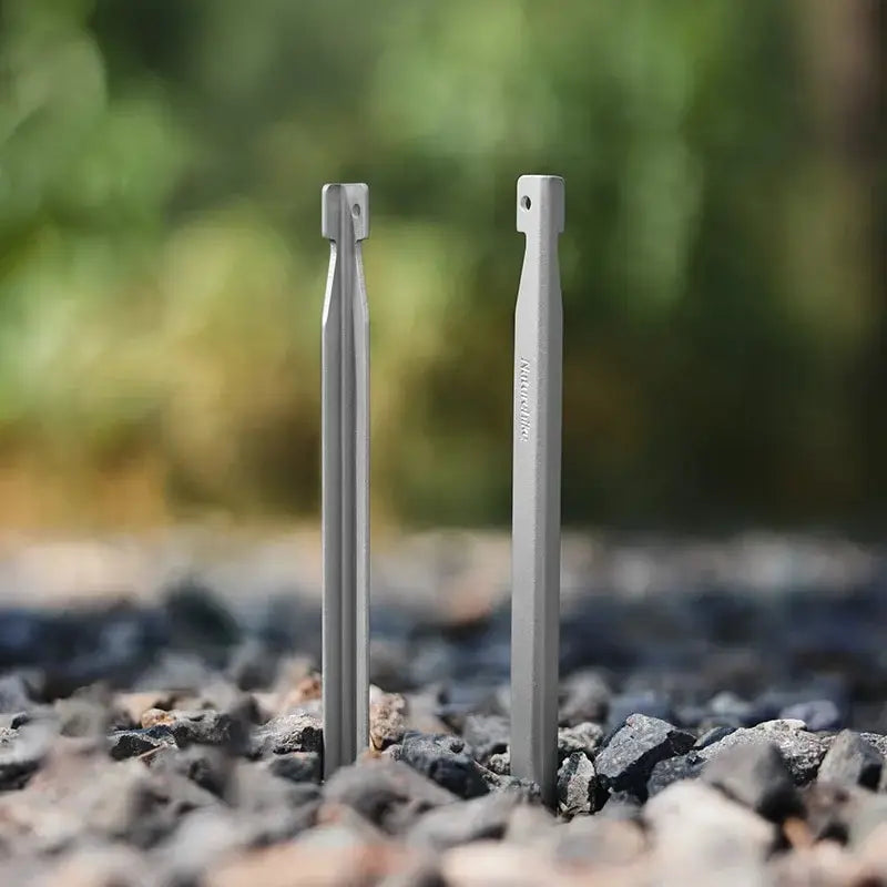 المواد: الأوتاد مصنوعة من سبائك الألومنيوم 7001 ، والتي تشتهر بقوتها العالية وموثوقيتها في ظل الظروف القاسية. وهذا يجعلها متينة للغاية وقادرة على تحمل البيئات القاسية، وهي مثالية للأنشطة الخارجية مثل التخييم.