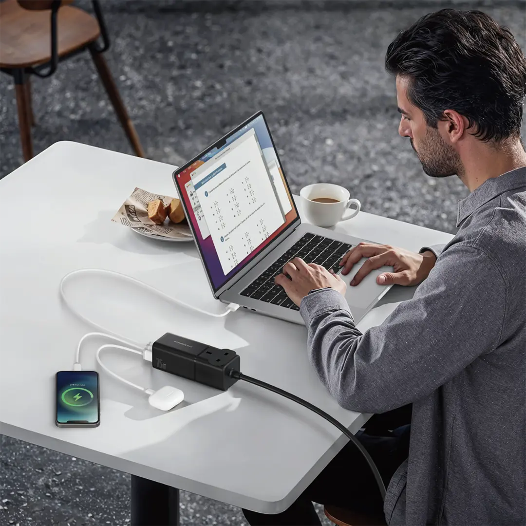The Powerology Desktop Charging Station is the ideal solution for all charging needs. With a rating of 250V~50Hz and 3250W maximum power, the station can power a variety of devices with its high-power outputs. Featuring USB-C1 and USB-C2 outputs, the station provides efficient and fast charging with PPS technology, with 3A and 5A, respectively. The USB-A1 and USB-A2 ports are more versatile, with 5V to 12V outputs, so you can use a wide range of devices. Based on GaN technology, the station is able to charge faster and more efficiently, such as PD 70W laptop charger mode. Since it can charge several devices at one time, it offers outputs like 45W + 30W and 70W + 5W, so you are never out of power. The pre-installed 70cm cable and fast charging feature (0% to 60% within 35 minutes) make it an indispensable item for the modern workplace.