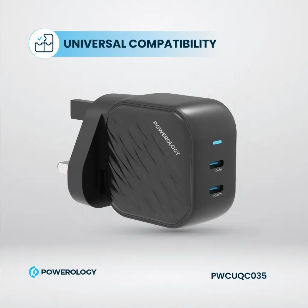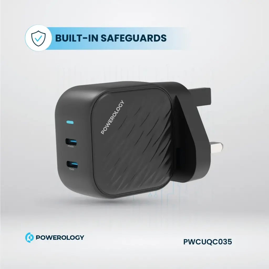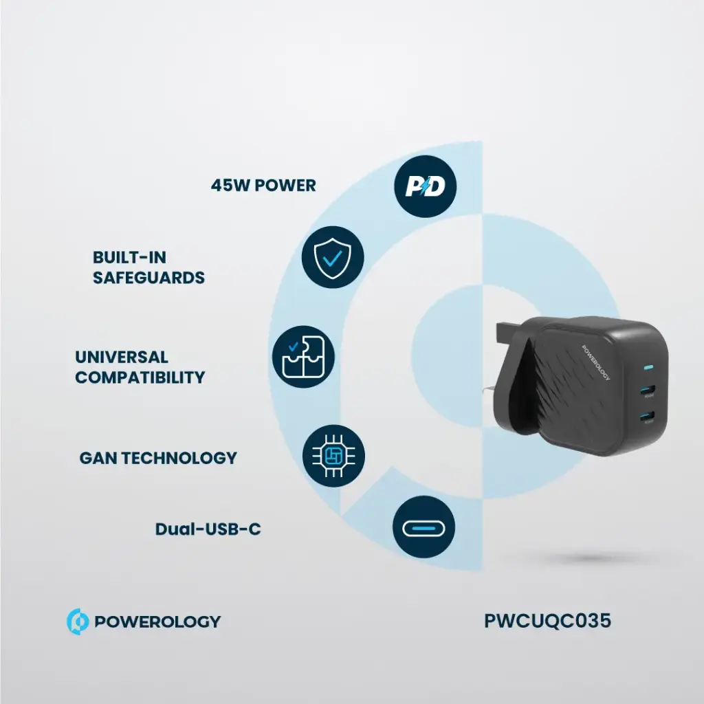شاحن الجدار ثنائي USB-C من باورولوجي بتقنية GaN: شحن سريع وآمن لأجهزتك، صغير الحجم للغاية. بجهد مقنن قياسي من 100-240 فولت وتواتر 50/60 هرتز، يعمل في معظم دول العالم بحد أقصى للتيار 1.5 أمبير - منفذي USB-C، اللذان يدعمان أيضاً تقنية توصيل الطاقة (PD) بقدرة 45 واط مع توترات متغيرة 5 فولت، 9 فولت، 12 فولت، 15 فولت، 20 فولت، كما يدعم الشحن السريع والفعال. يدعم المنفذ الثاني الإضافي أيضاً تحسين مصدر الطاقة القابل للبرمجة (PPS) لتوفير أقصى قدر من تنوع الشحن. باستخدام أحدث تقنية GaN، يوفر خرج طاقة عالي في حجم صغير، ويقلل من توليد الحرارة وتبديدها، مما يؤدي إلى زيادة الكفاءة. متوافق مع العديد من الأجهزة، مثل الهواتف الذكية، والأجهزة اللوحية، وأجهزة الكمبيوتر المحمولة، أو أي شيء آخر. تم تصميم هذه الحماية المدمجة لحماية أجهزتك من الشحن الزائد، وارتفاع درجة الحرارة، والدوائر القصيرة، لضمان شحن آمن وموثوق.