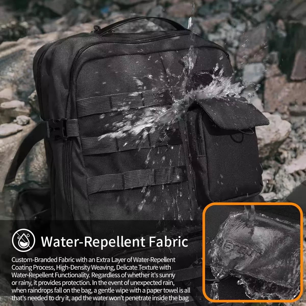 المميزات: هذه الحقيبة الظهرية مناسبة لمجموعة متنوعة من السيناريوهات، ركوب الدراجات، الاستخدام التكتيكي، المشي لمسافات طويلة، والتخييم، سعتها الكبيرة 28 لترًا تسمح بحمل المعدات اللازمة لشخص واحد للتخييم الخفيف. يمكنها استيعاب كمبيوتر محمول مقاس 17 بوصة، مع جيب أمامي بسحاب وجيوب صغيرة، وتصميم تخزين مريح، وإمكانية الوصول السهل، وشريط مطاطي، وتخزين عملي. نظام خارجي تكتيكي من نسيج MOLLE في الأمام، قابل للتمديد حسب الرغبة. لوحة ظهرية قابلة للتهوية، مع تخفيف الضغط المرن. يمكن ضبط مشبك الصدر ومشبك الخصر بحرية، لراحة ثابتة، مع وجود لوح لاصق من مادة PE مدمج في الأشرطة، وتعزيز بخياطة سميكة، لتعزيز تحمل الأشرطة، وتشكيلها بشكل جيد. أشرطة ضغط على جانبي الحقيبة، يمكن تعليق وتثبيت حبل النجاة، وأعمدة المشي لمسافات طويلة، إلخ، مع جيوب قابلة للإزالة، ويمكن استخدامها بشكل منفصل أو معًا بعد فكها.