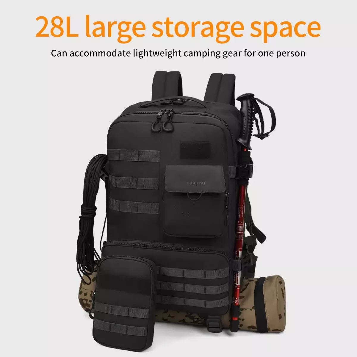 حقيبة ظهر تيجيرنو متعددة الوظائف بسعة كبيرة 28 لترًا، مناسبة للتصوير الفوتوغرافي والتخييم والمغامرات، مع مساحة لحفظ الكمبيوتر المحمول.
