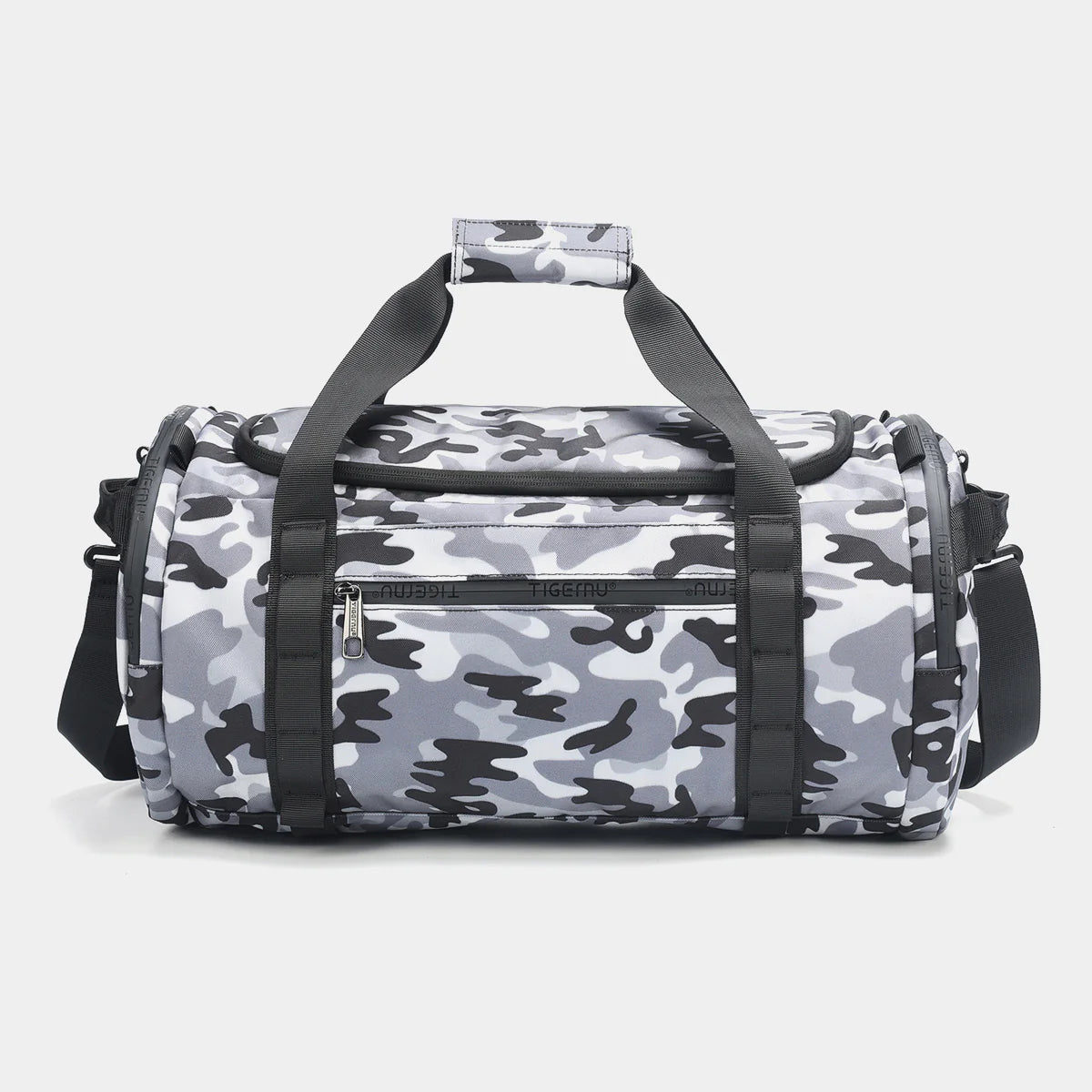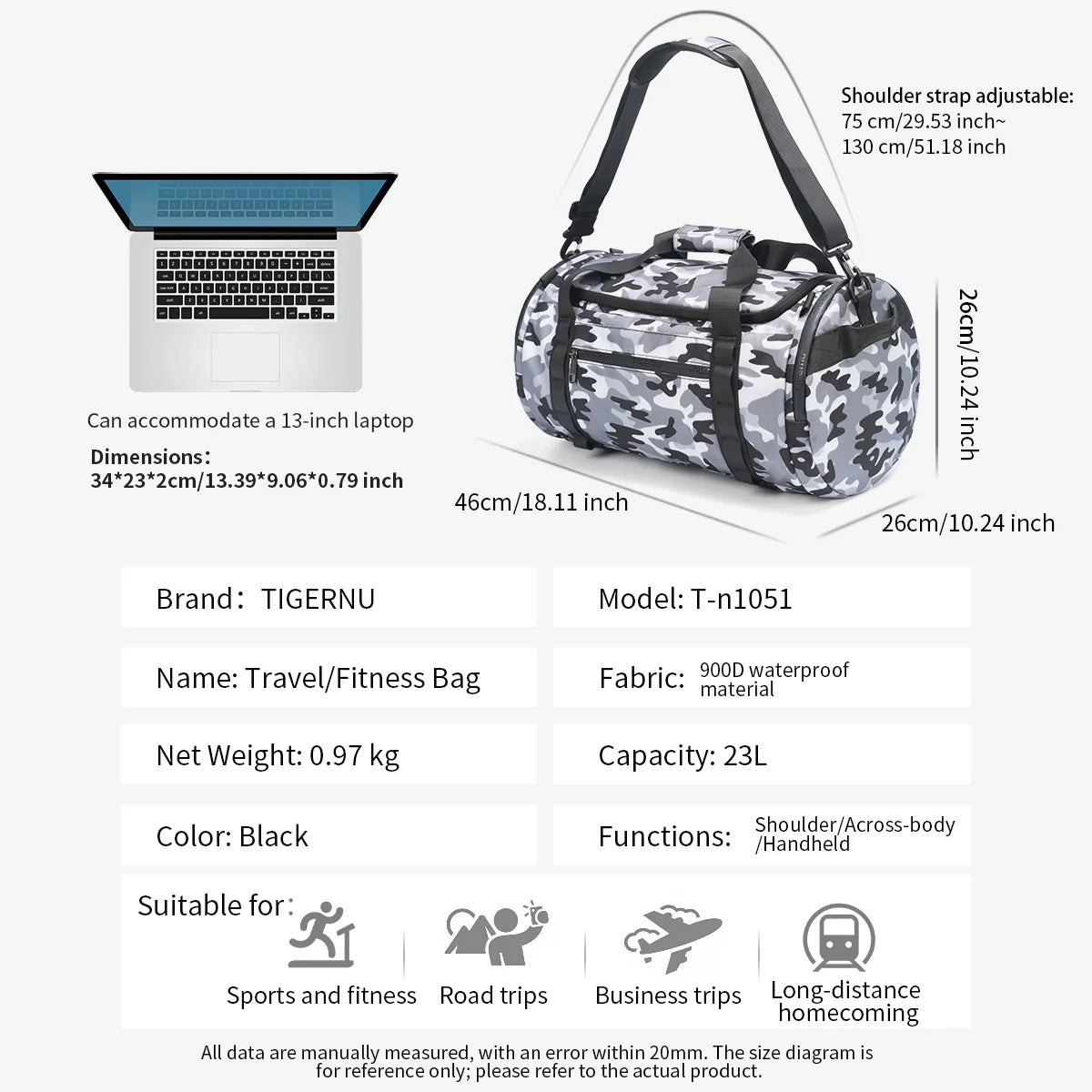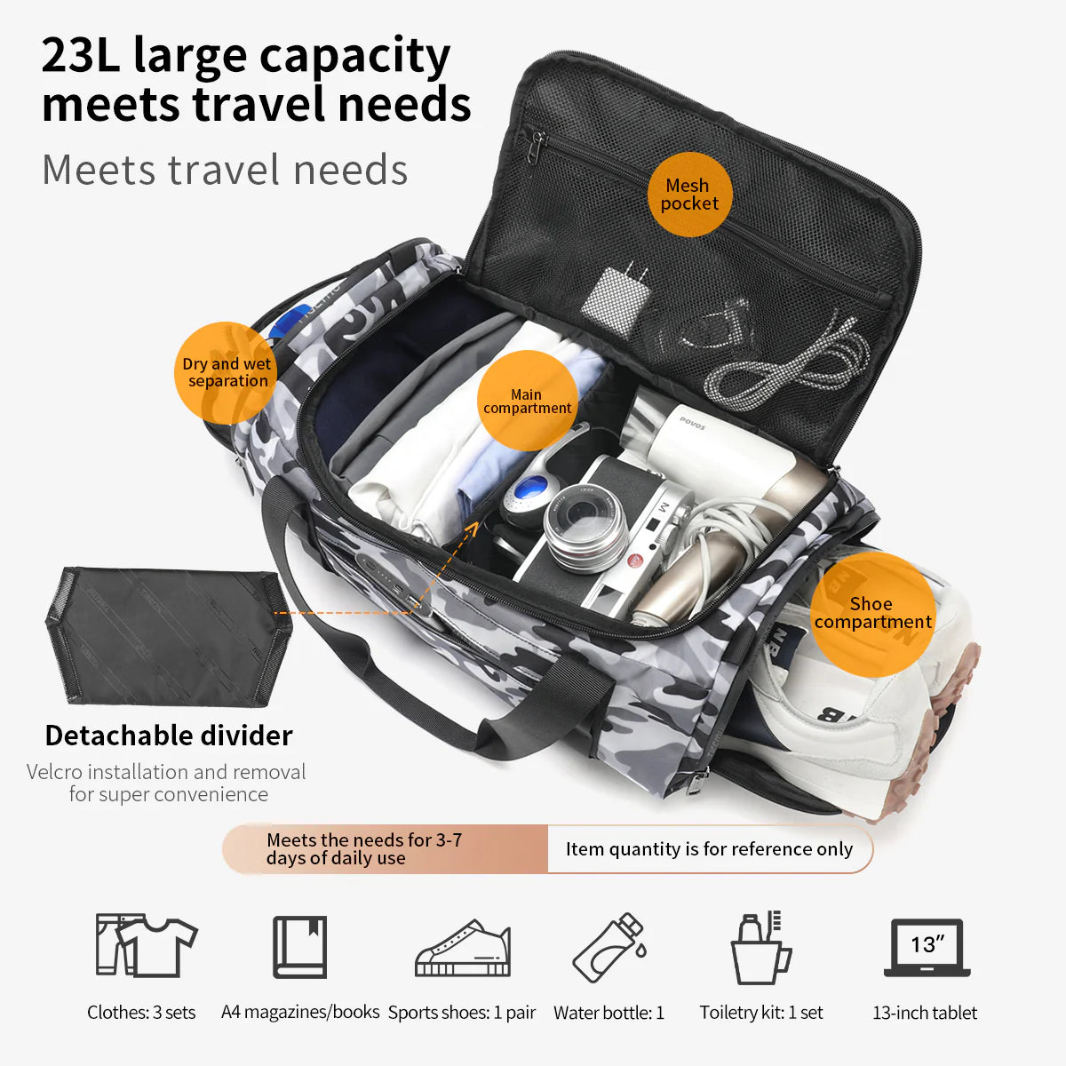 السعة: هذه حقيبة رياضية للسفر بسعة تصل إلى 23 لترًا، متوفرة بثلاثة ألوان: أسود، أسود مموه، وأسود رمادي مموه، وتتميز بحافظات منفصلة للرطب والجاف، وحافظات شبكية بسحاب، وحافظة منفصلة للأحذية، وحافظة رئيسية كبيرة السعة، وحافظة أمامية بسحاب. تصميم فاصل قابل للفصل، فصل جاف ورطب.