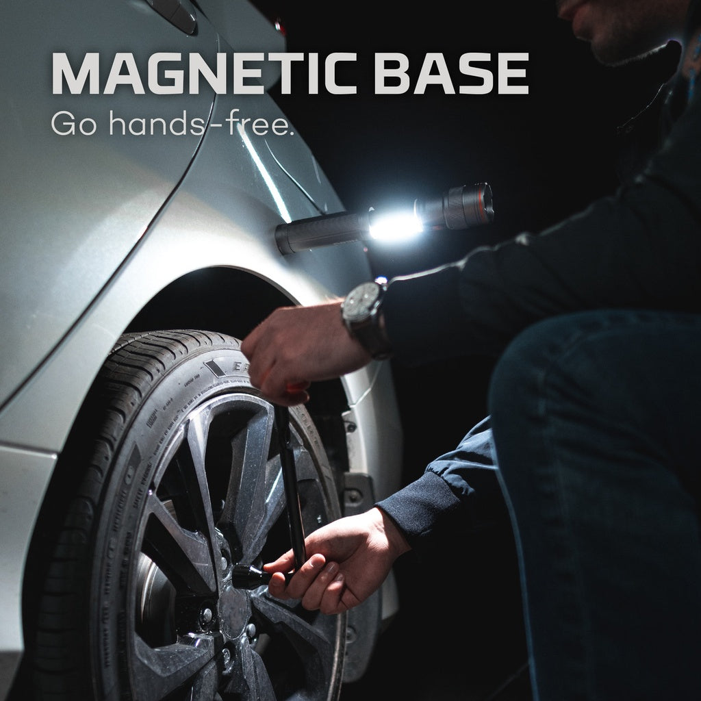 The FRANKLIN™ SLIDE is a high-powered 500 lumen C•O•B LED flashlight and work light, retractable clip, and powerful magnetic base. It features 7 light modes, Direct-to-Red, and Power Memory Recall. The powerful LED flashlight can shine up to 160 meters away. The included battery allows for up to 60 hours of operation in between charges.