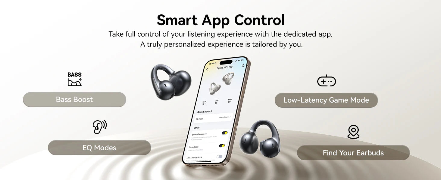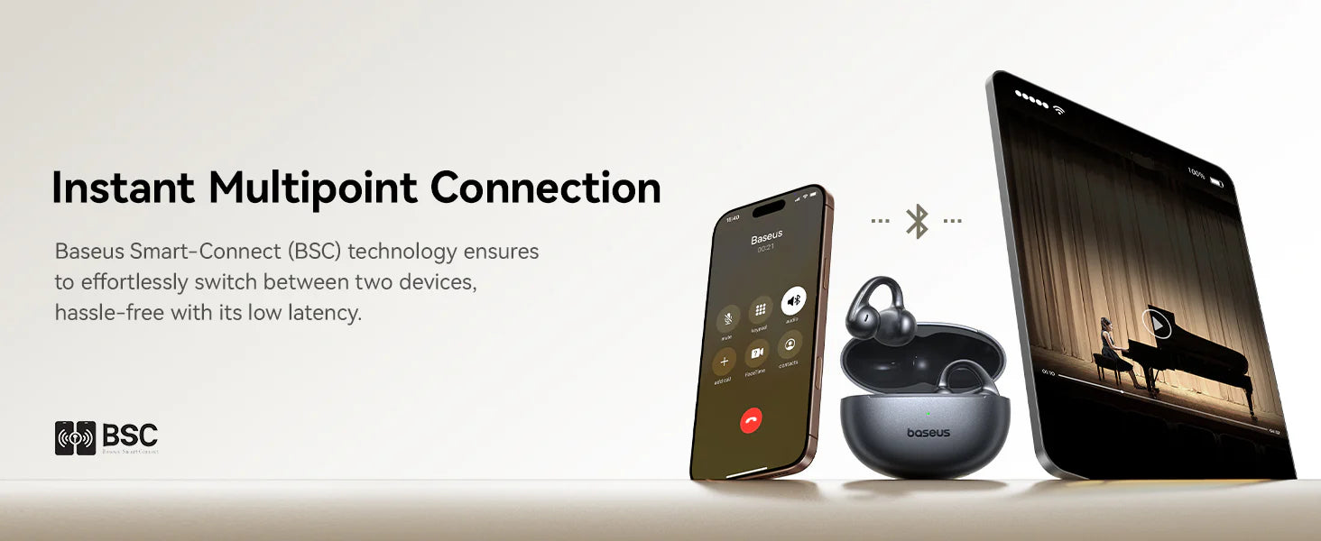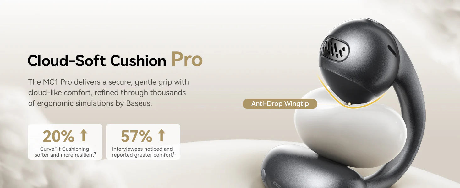 Baseus Bowie MC1 Pro Open-Ear TWS Earbuds combine 5g lightweight comfort with CurveFit cushions and a flexible U-ring. Boasting Tri-Magnet Drivers, LDAC tech, IP67 waterproof, 40-hour battery, and app-controlled buttons, they deliver studio sound for active days.