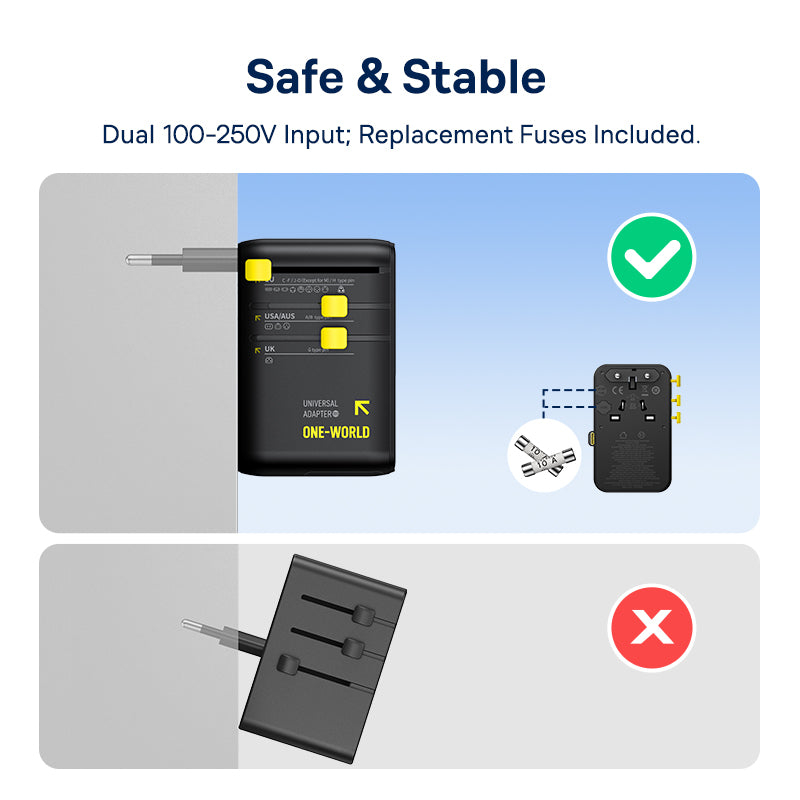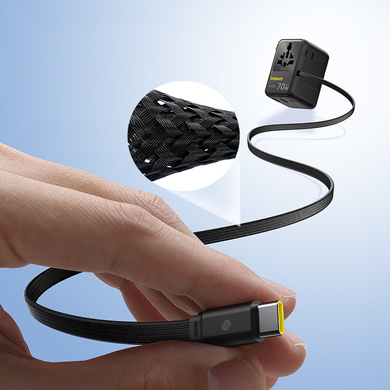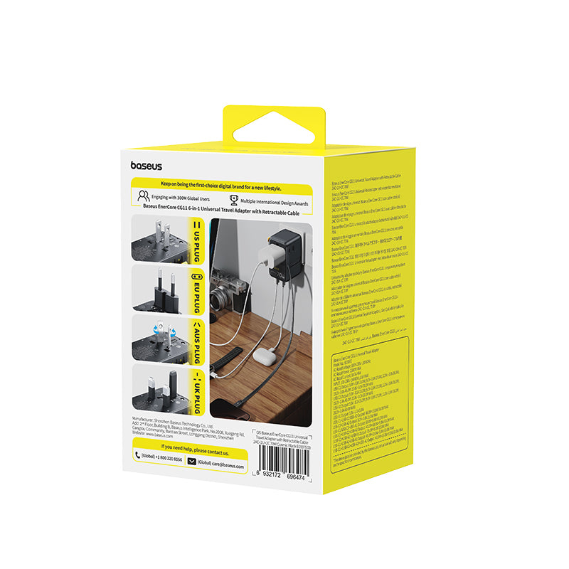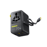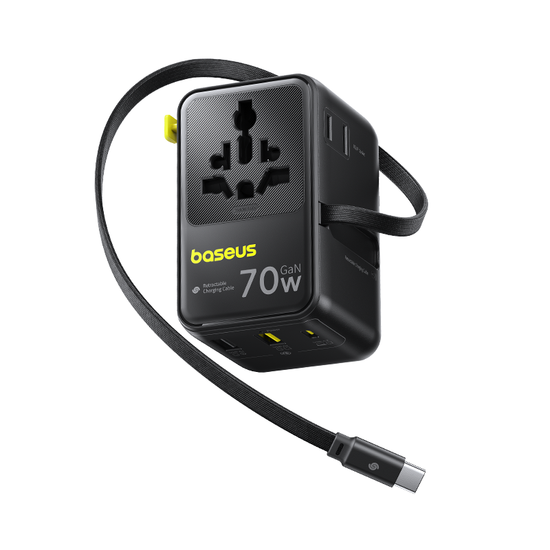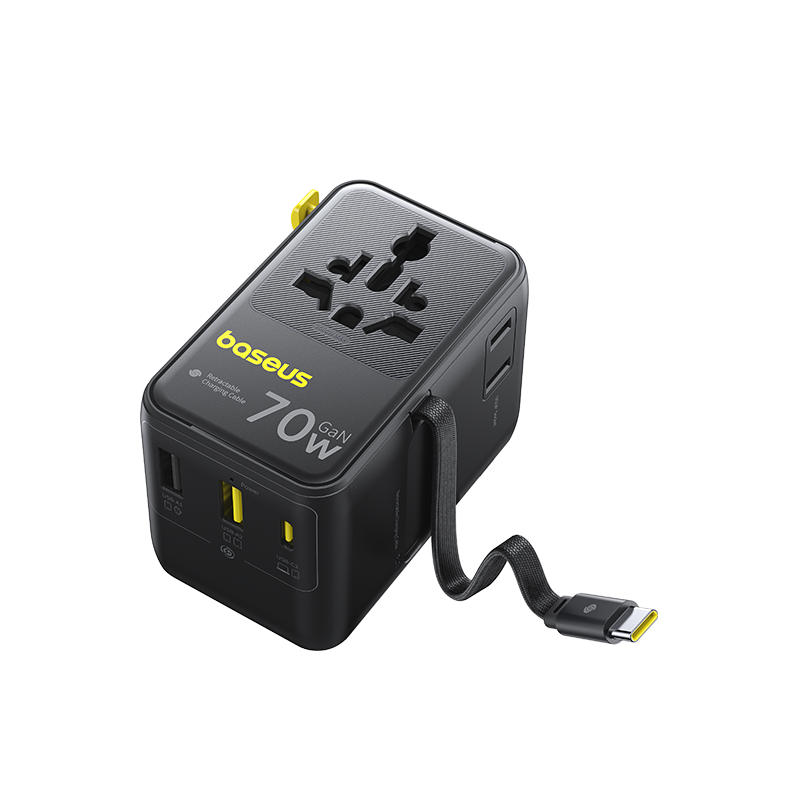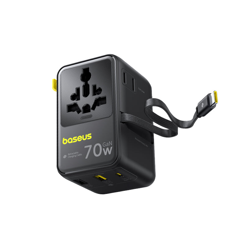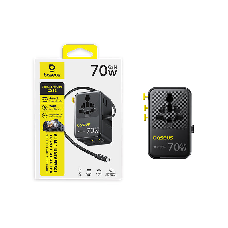 Baseus EnerCore CG11 Universal Travel Adapter with Retractable Cable 2AC+2U+2C 70W powers 6 devices globally with 70W fast charging and safety features. Order now for worry-free travel!