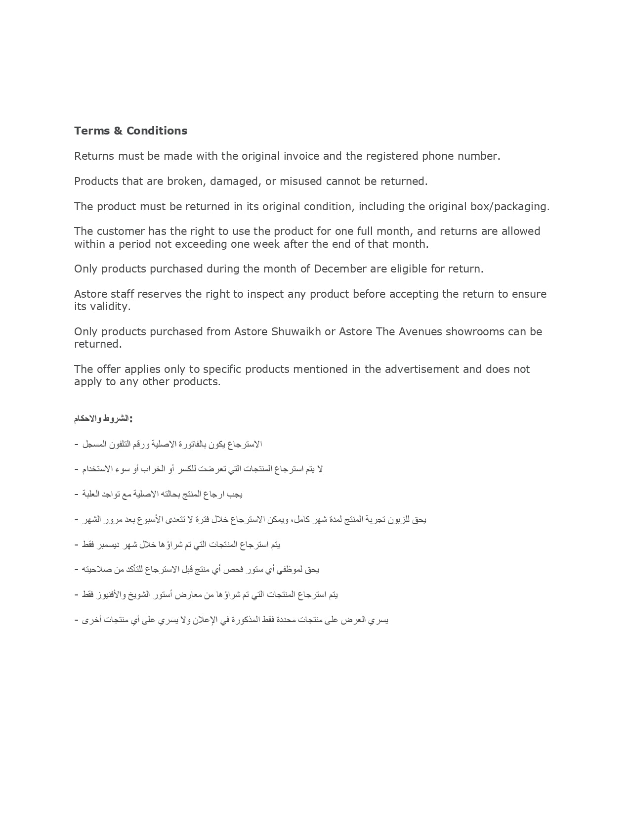Only products purchased from Astore Shuwaikh or Astore The Avenues showrooms can be returned.