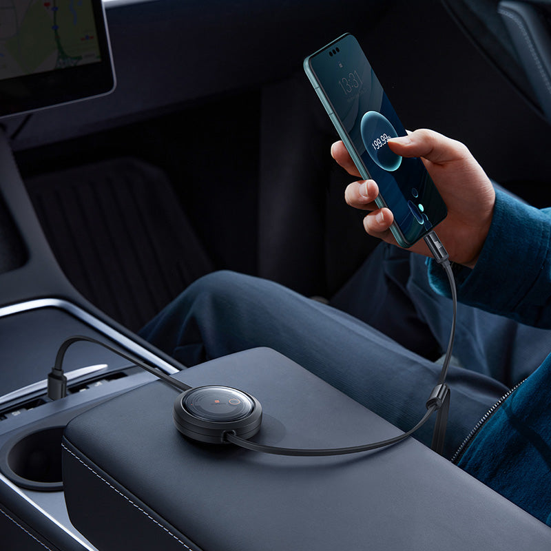 Smooth retractable mechanism adjusts cable length (up to 1.1 m) and automatically retracts when not in use—ideal for cars, desks, or travel bags.