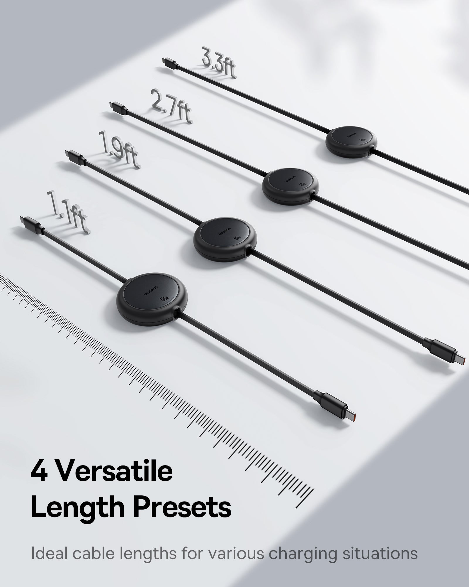 Featuring an adjustable length with four extension settings (1.1ft, 1.9ft, 2.7ft, and 3.3ft), this cable ensures a tidy workspace while eliminating cable clutter. It delivers 60W fast charging, making it ideal for laptops, smartphones, tablets, and other USB-C devices, including the latest iPhone 16 series.