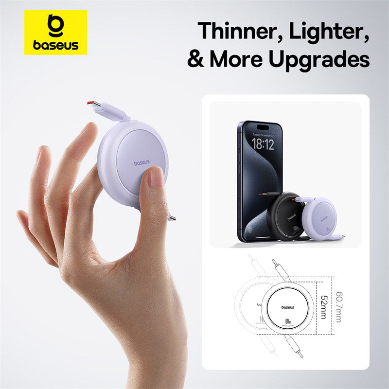 Upgrade your charging and connectivity experience with the Baseus Free2Pull Mini Retractable USB-C to USB-C Cable. Designed for maximum portability, this ultra-thin (15mm) and lightweight (34g) cable fits easily into any bag, making it the perfect companion for travel and daily commuting.