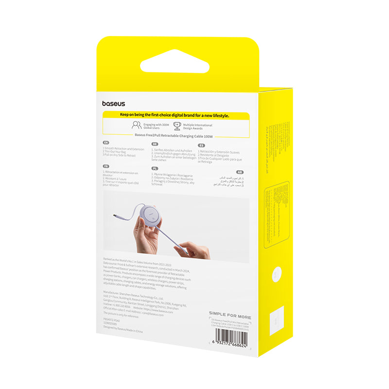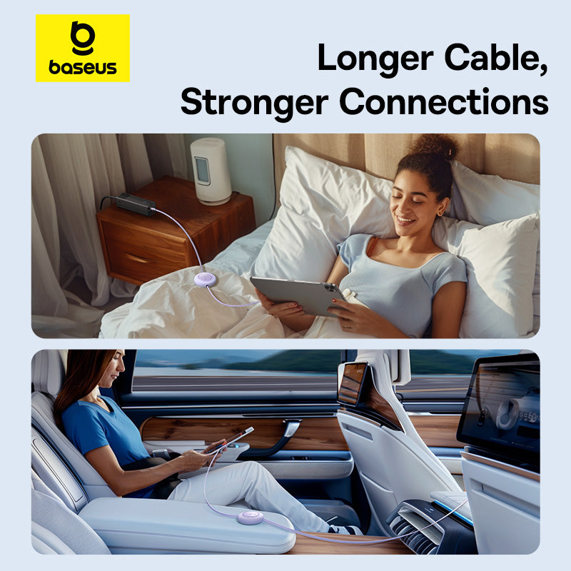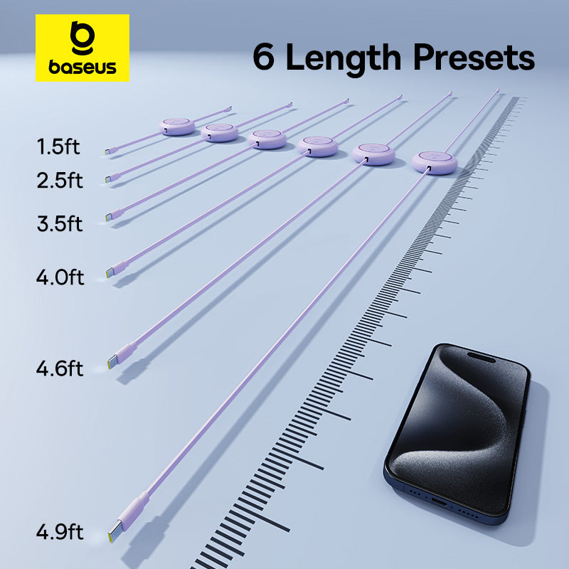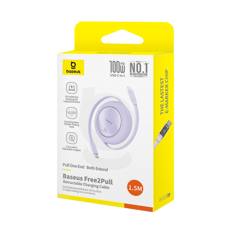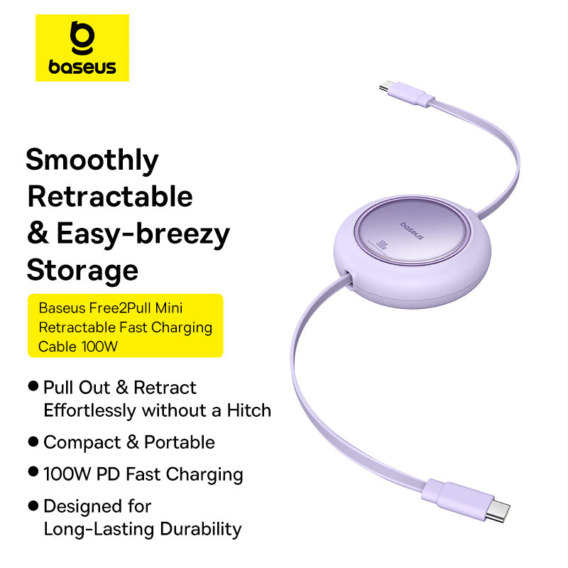 Baseus Free2Draw PD 100W Type-C Retractable Cable can be Stretched all you want. Pull out to use, and let go for storage, smooth without snags; Maximum PD 100W power output can fast charge your phones, tablets and laptops; E-marker Smart Chip, smart recognition of fast charging devices helps them control current and voltage properly and ensures safe charging;480Mbps Transmission Rate, up to 480Mbps transmission rate, equally fast as the charging.