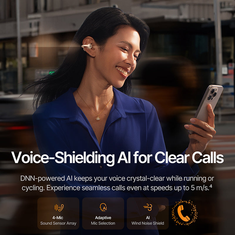 4-Mic AI Clear Calls: Enjoy seamless, crystal-clear calls on the move. A 4-mic array with AI voice pickup and wind-noise reduction keeps you clearly heard—even through traffic, crowds, or cycling at speeds up to 5m/s.
