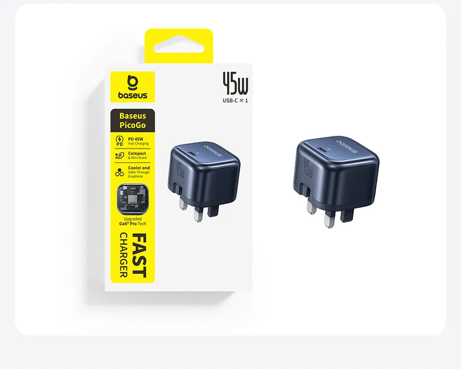 Experience ultra-fast, efficient charging with the Baseus PicoGo AE11, a compact 45W GaN charger equipped with a single USB-C port and a UK 3-pin plug. Thanks to advanced GaN technology, it delivers powerful charging while staying compact and cool. Perfect for smartphones, tablets, and even USB-C laptops, all in a sleek Cosmic Black finish ideal for home, office, or travel.
