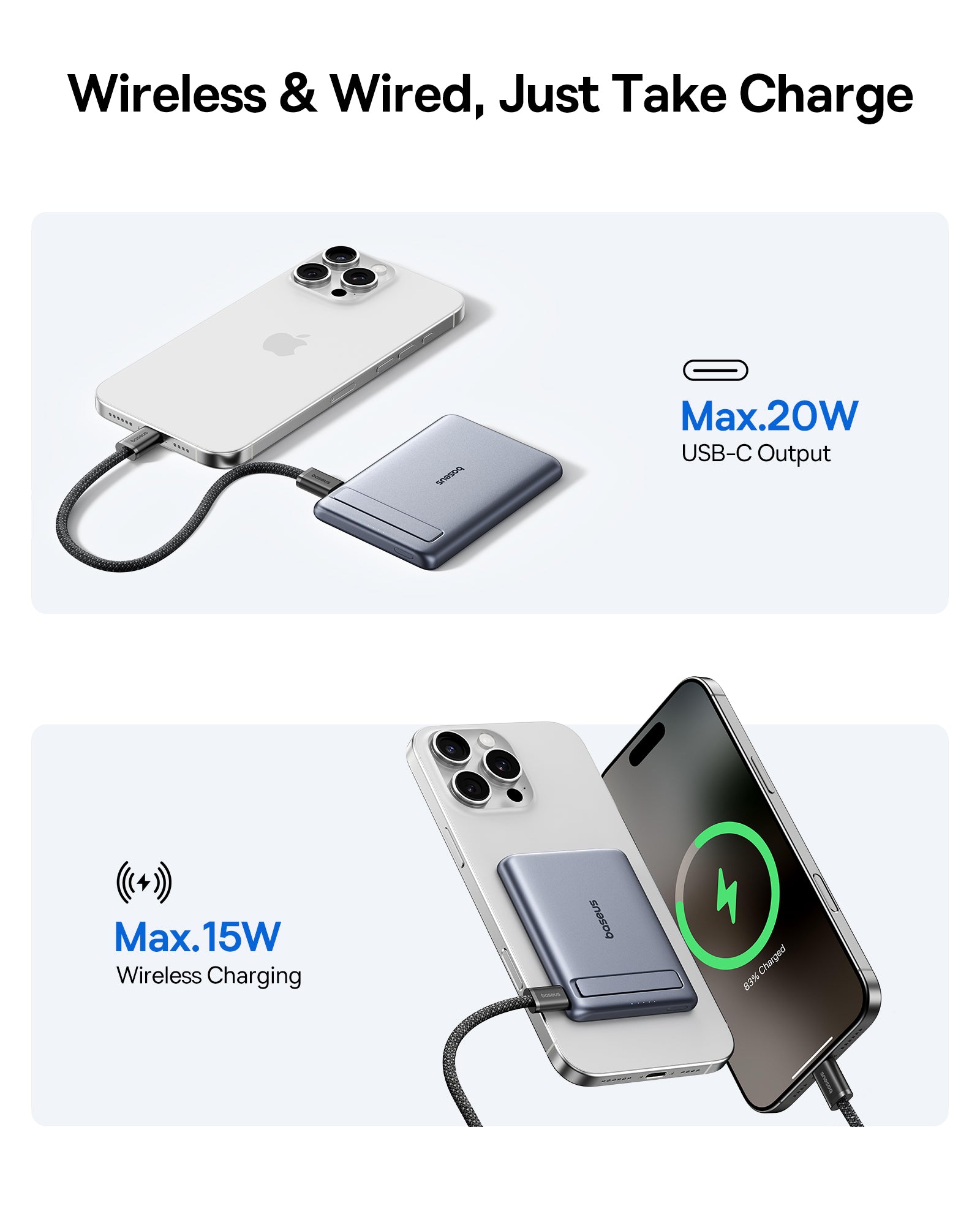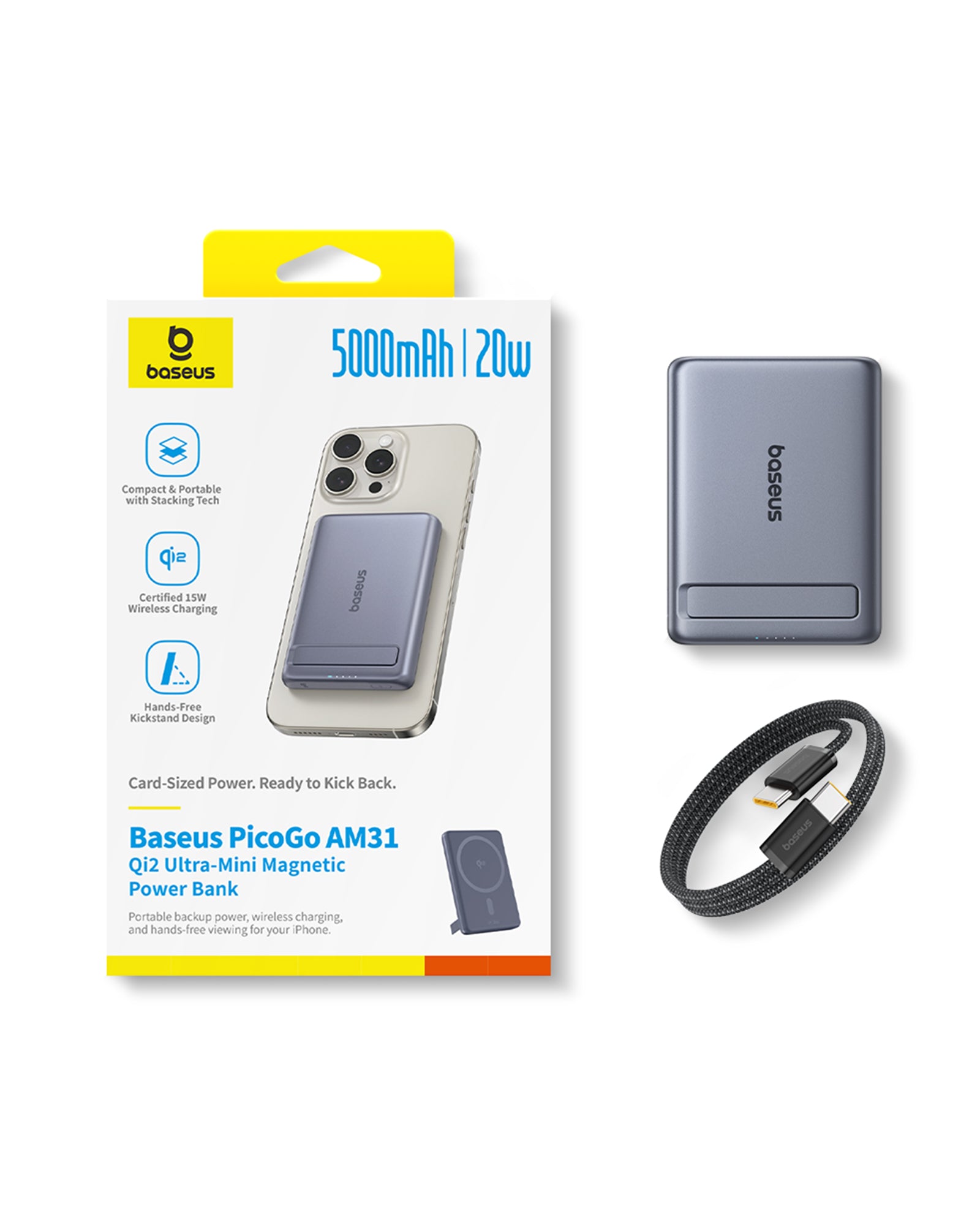 Included Cable: Includes a 20cm USB-C to USB-C braided cable in black, facilitating wired charging for other devices.
