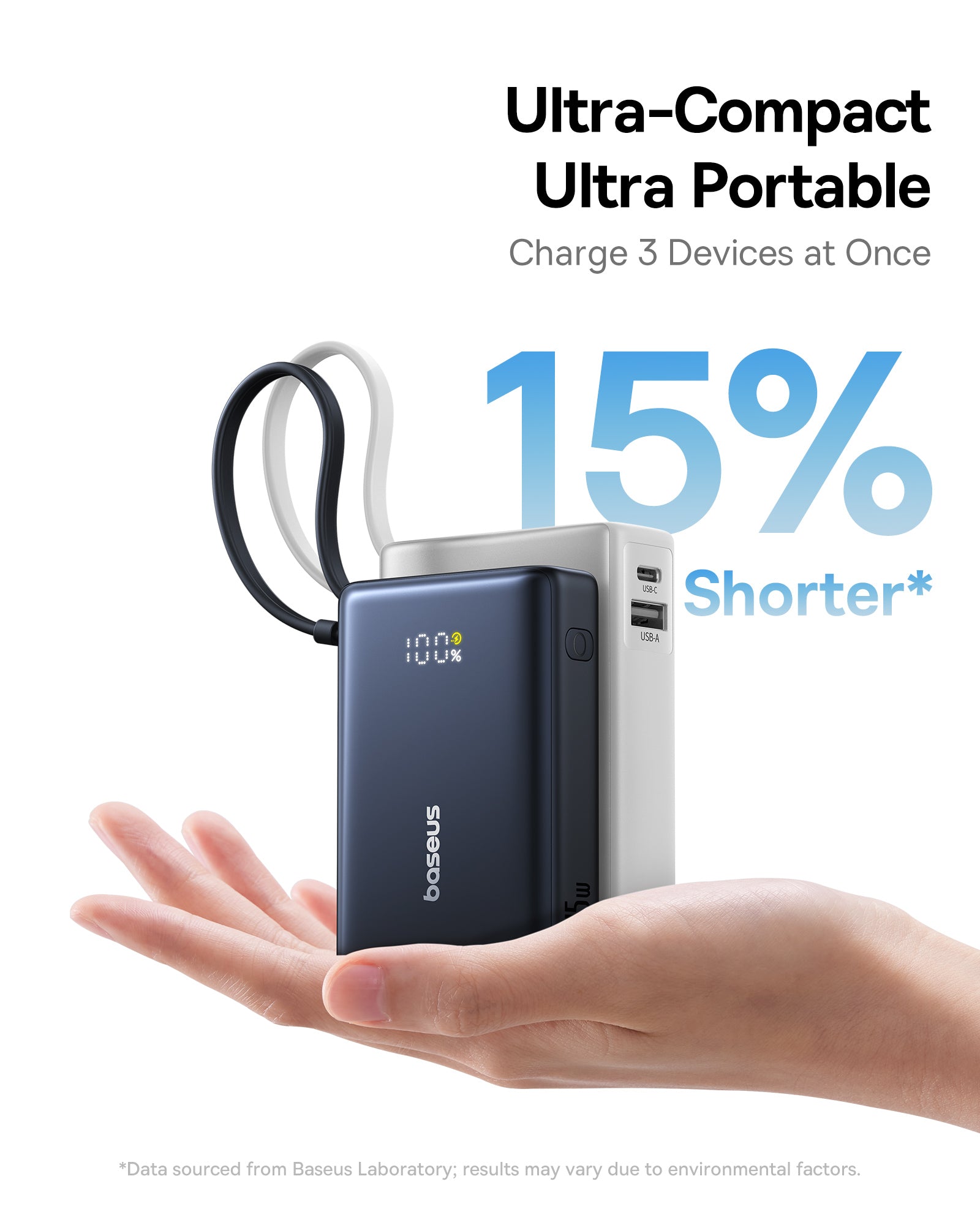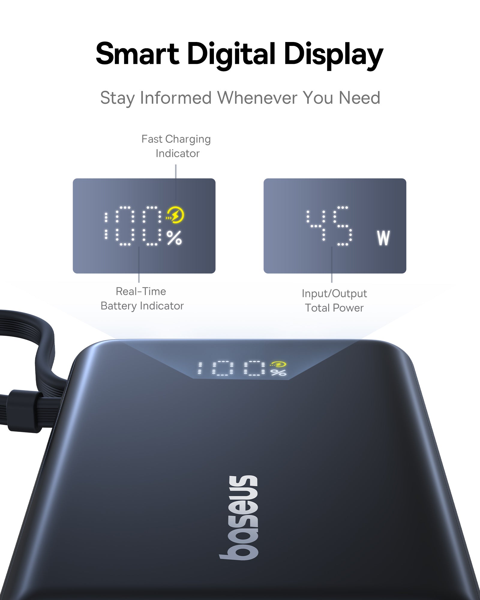 Boasting a staggering 45W output,Baseus portable charger rapidly replenishes your devices batteries, cutting down charging time significantly. Utilize the built-in cable to elevate your iPhone 16 Pro to 57% or S24 Ultra to 63% in 30 minutes,perfect for travel and business trip.