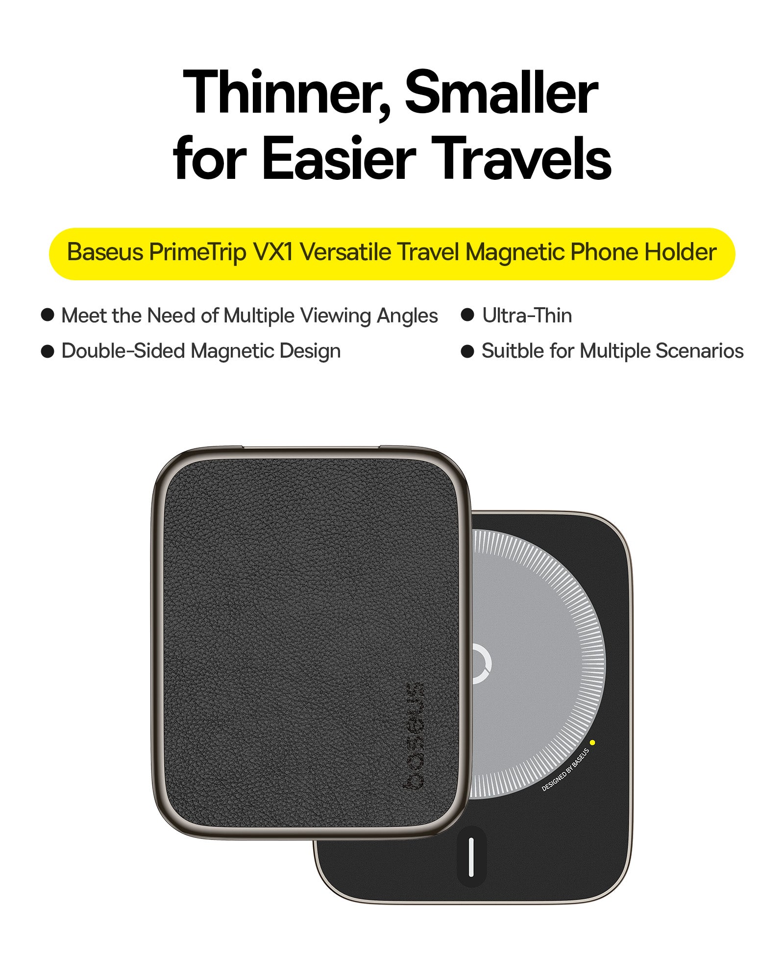 The Baseus PrimeTrip VX1 is a premium magnetic phone holder crafted for convenience, style, and durability. Featuring a sleek, ultra-thin design with foldable functionality, it’s perfect for use in cars, offices, or at home. Its dual-sided magnetic attraction ensures a firm grip on your phone, while the 3-axis adjustable mechanism allows for precise viewing angles. Made with high-quality zinc alloy and leather, the VX1 offers a luxurious feel and long-lasting performance. Whether you’re navigating on the road or video calling at your desk, this holder delivers both stability and sophistication.