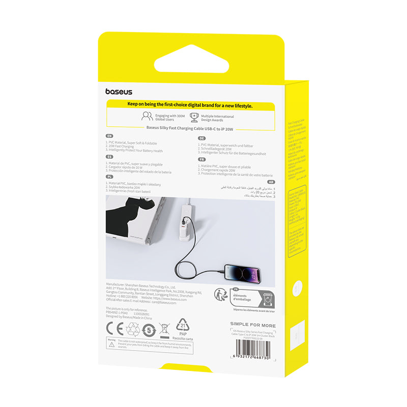 The Baseus Silky Series Fast Charging Cable offers a sleek design and efficient performance, featuring a Type-C to Lightning connection with 20W Power Delivery for rapid charging and data transfer.