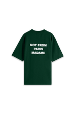 The Slogan tee. Made of 100% cotton interlock fabric, this t-shirt features a ribbed neckline and the 'Not From Paris Madame' slogan printed front and back.