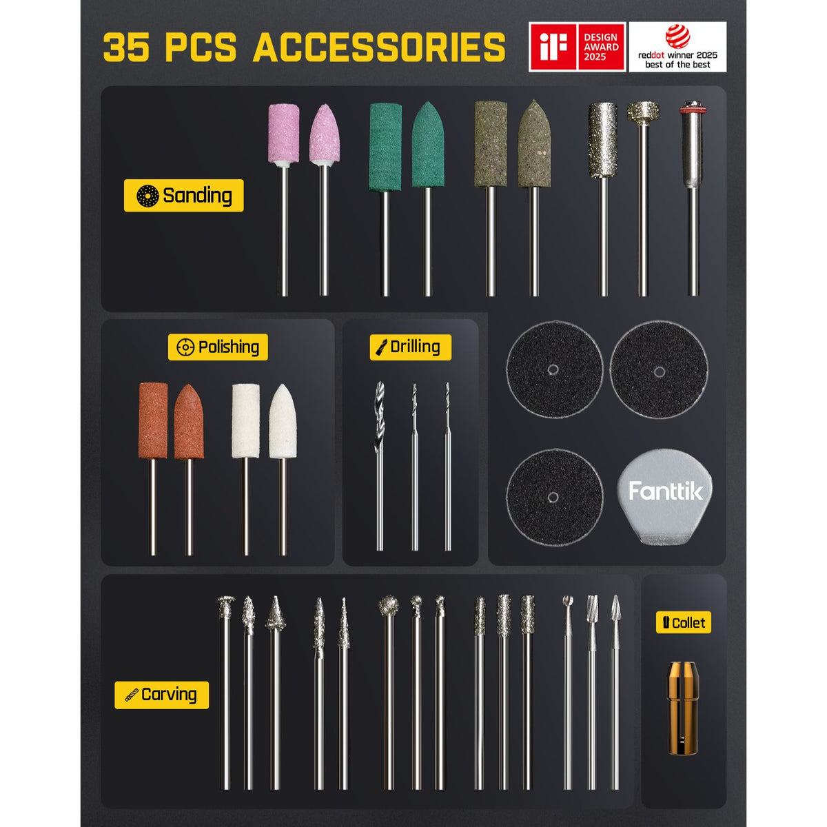No more searching for attachments! The F2 Master features a 360° rotating magnetic stand with 35 organized accessories, making DIY tasks like grinding, polishing, drilling and engraving easy and convenient