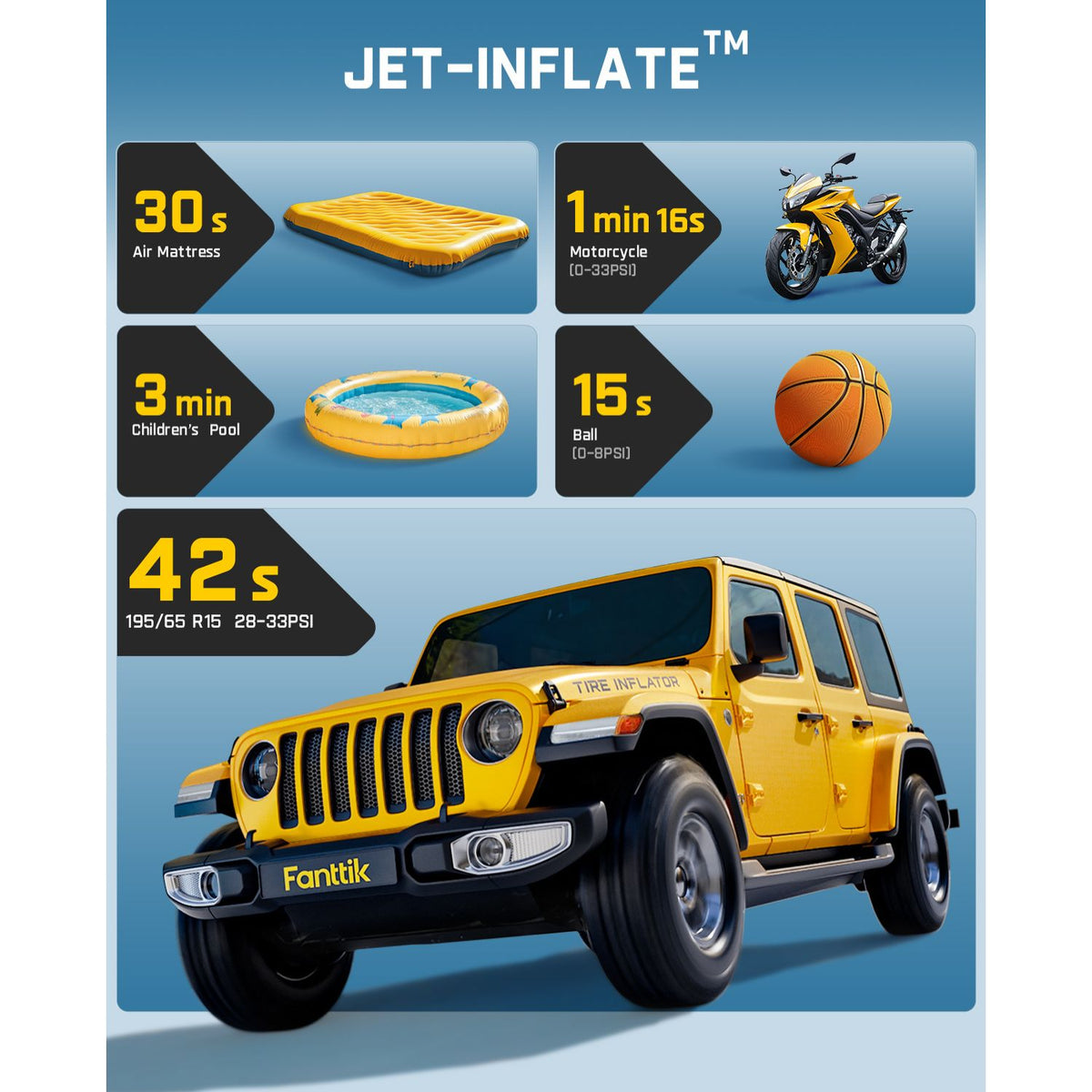 Jet-speed inflation from Fanttik sets a new industry standard. Featuring a newly upgraded motor drive, the X10 Cross inflates tires in 1 minute and fills an air mattress in an unprecedented 30 seconds