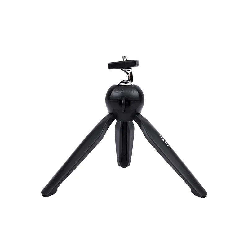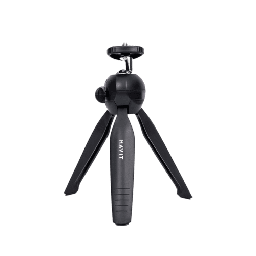- Desktop tripod with a 1/4" screw that supports phones, cameras, or projectors.