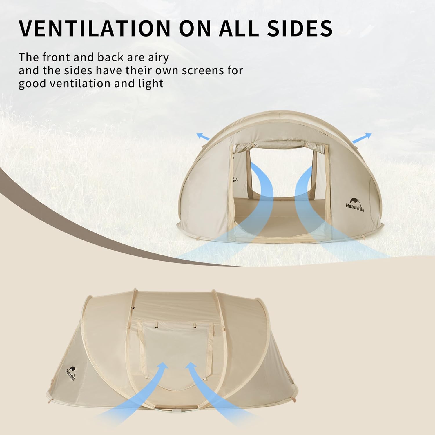 Ventilation on All Sides: The automatic tent has front and back ventilation, with two side screen windows, which brings good ventilation and lighting effect, air circulation inside and outside the tent, ensuring good ventilation of the tent.