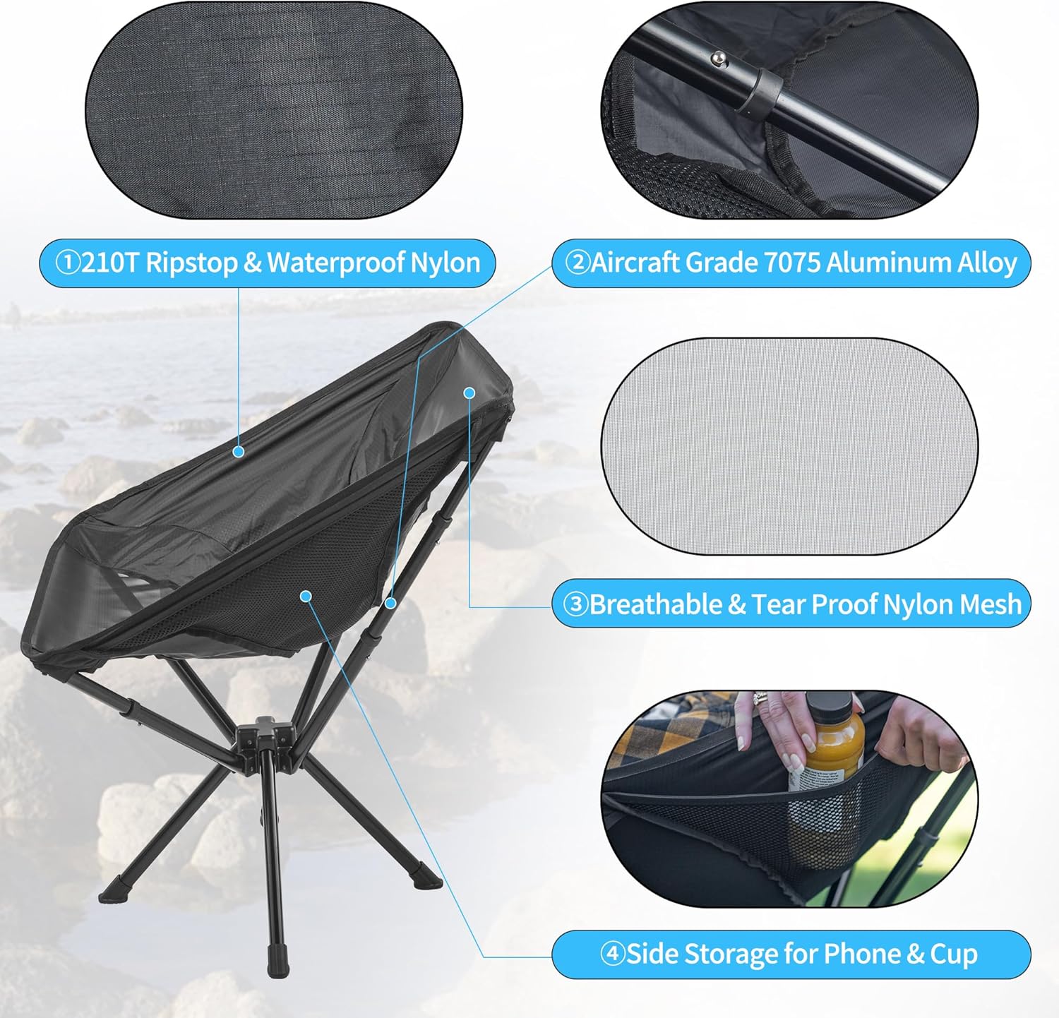 For increased comfort, the chair seat is made of breathable 190G thickened nylon mesh + 600D Oxford cloth. Our camping chair also has under-seat storage space, allowing you to easily store small items.