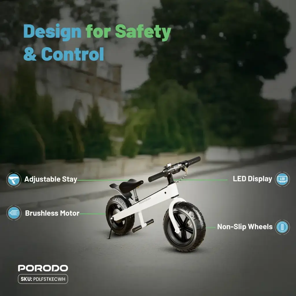 The Porodo JoyCruiser Kids Electric Bike provides an exciting and safe way for youngsters to travel outside. Wheel size: 6.5", with non-slip tires to enhance stability; the adjustable seat caters to comfort as they grow. The maximum motor-powered speed of 15 km/hr is apt for kids between 3 and 14 years with a powerful brushless motor. With 3 gears and an LED display, the riding experience can be adjusted easily, and young riders can change speeds. The bike is meant to carry a maximum of 75kg, providing durability and long life. The JoyCruiser comes with a 2600mAh battery offering 5 to 6 hours of fun and adventure and a DC charging port to recharge quickly in 5 to 6 hours. The JoyCruiser is by far the perfect partner to ferry your kids on their maiden adventures.