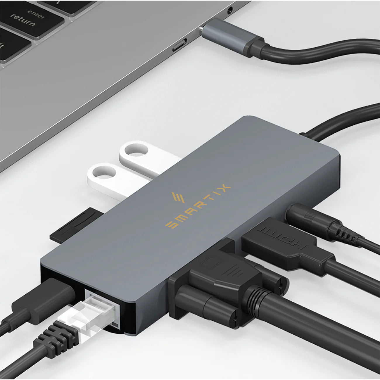 Smartix 9 in 1 Type-C Hub is where versatility meets style in a compact and powerful package. With its sleek silver and black color combination, this hub adds a touch of sophistication to your workstation, blending seamlessly with your modern lifestyle. Its compact and lightweight design makes it the perfect companion for your laptop, allowing you to carry it effortlessly wherever you go. Experience enhanced connectivity with this hub, as it is compatible with a wide range of devices, including laptops, tablets, and smartphones that support Type-C connectivity. From expanding your laptop's ports to connecting multiple devices simultaneously, the Smartix 9 in 1 Type-C Hub is your all-in-one solution.