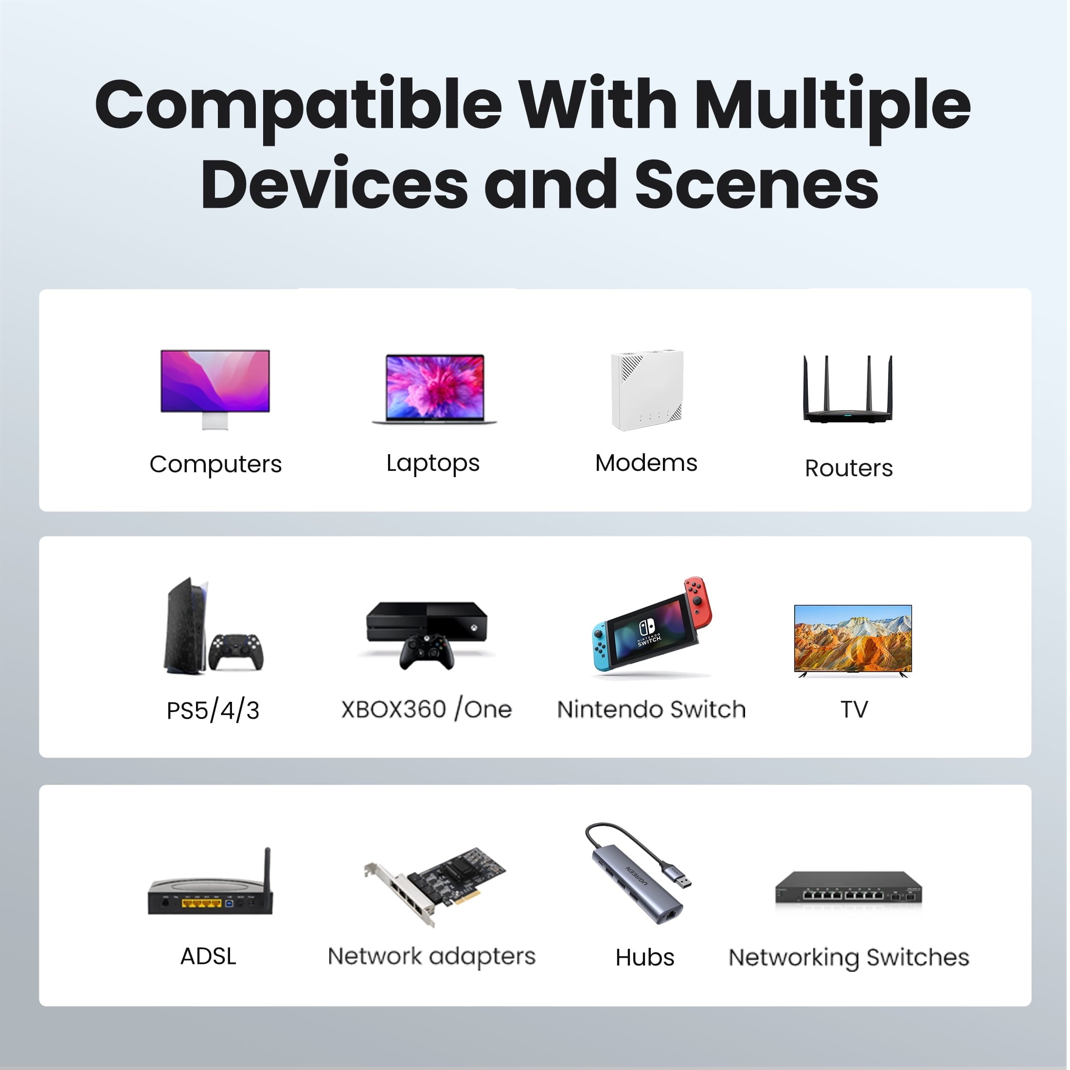 Perfectly compatible with computers, laptops, modems, routers, PS5, PS4, PS3, X-Box 360, X-Box One, Switch, networking switches, ADSL, network adapters, hubs, and other networking devices.
