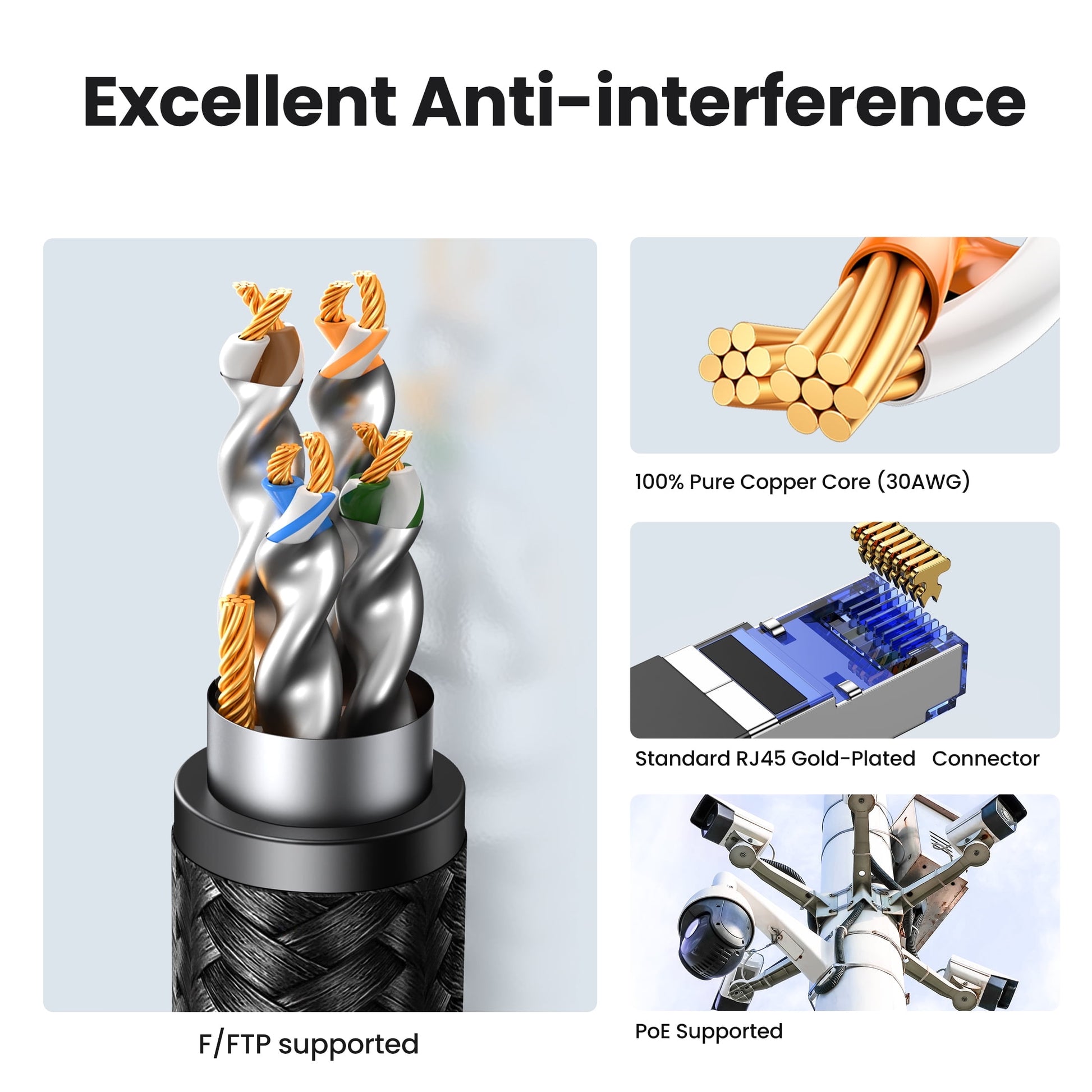 Designed with 4 shielded foiled twisted pairs (F/FTP) and an aluminum foil shielding layer.